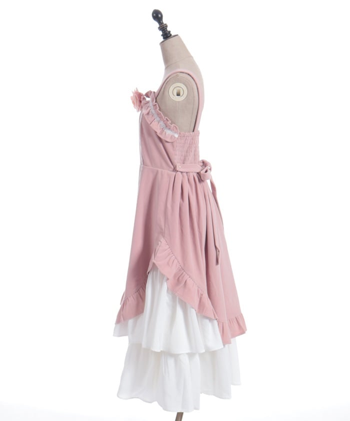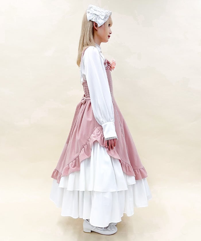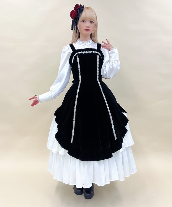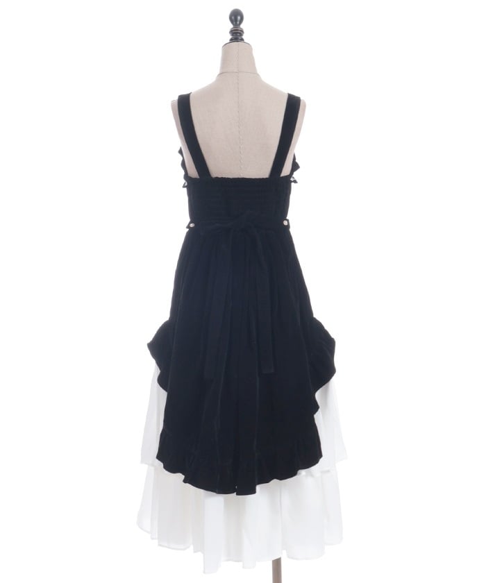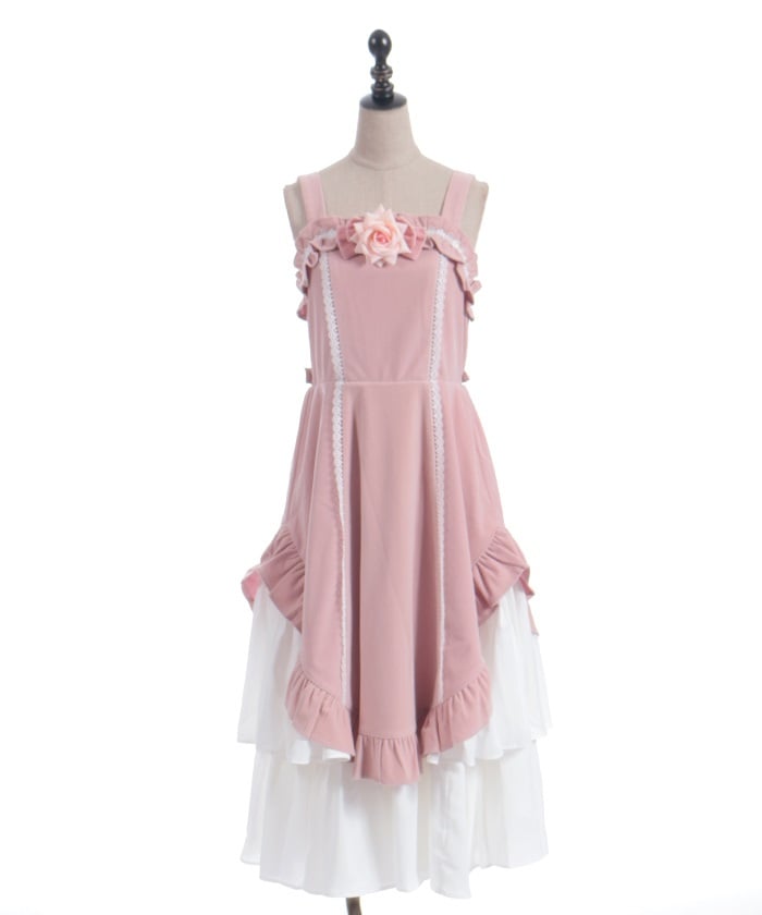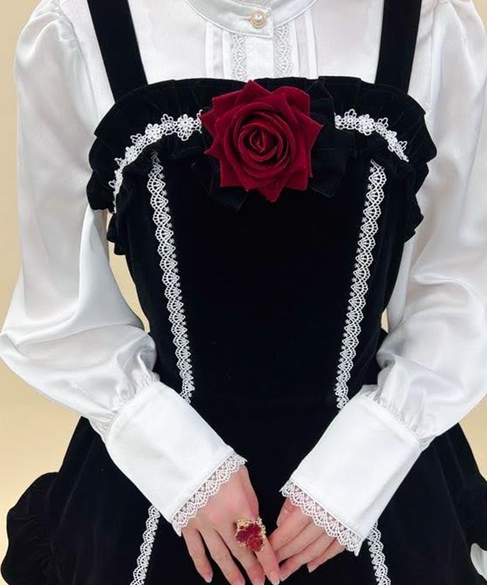 The flared hemline and clean waistline are accented with frills made of different materials. The rose on the chest is a brooch and can be removed.