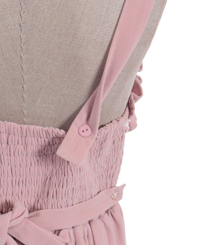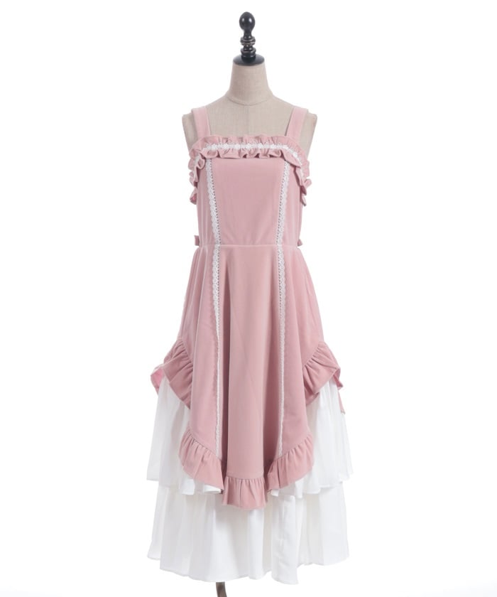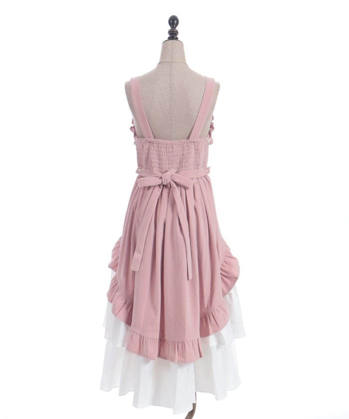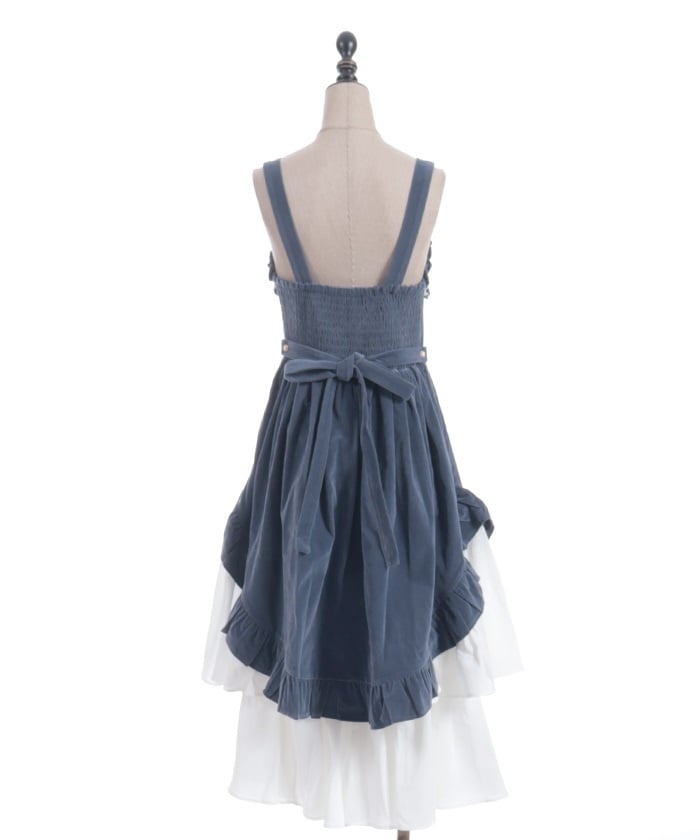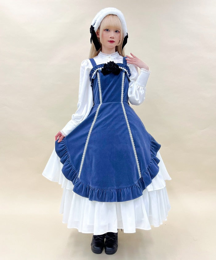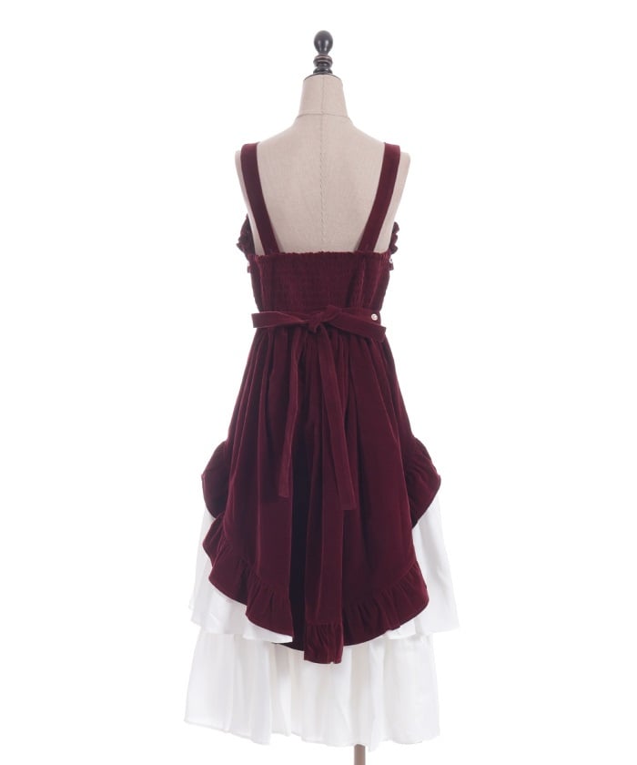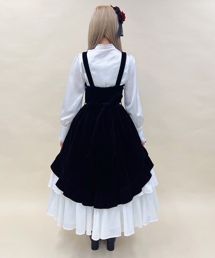 The flared hemline and clean waistline are accented with frills made of different materials. The rose on the chest is a brooch and can be removed.