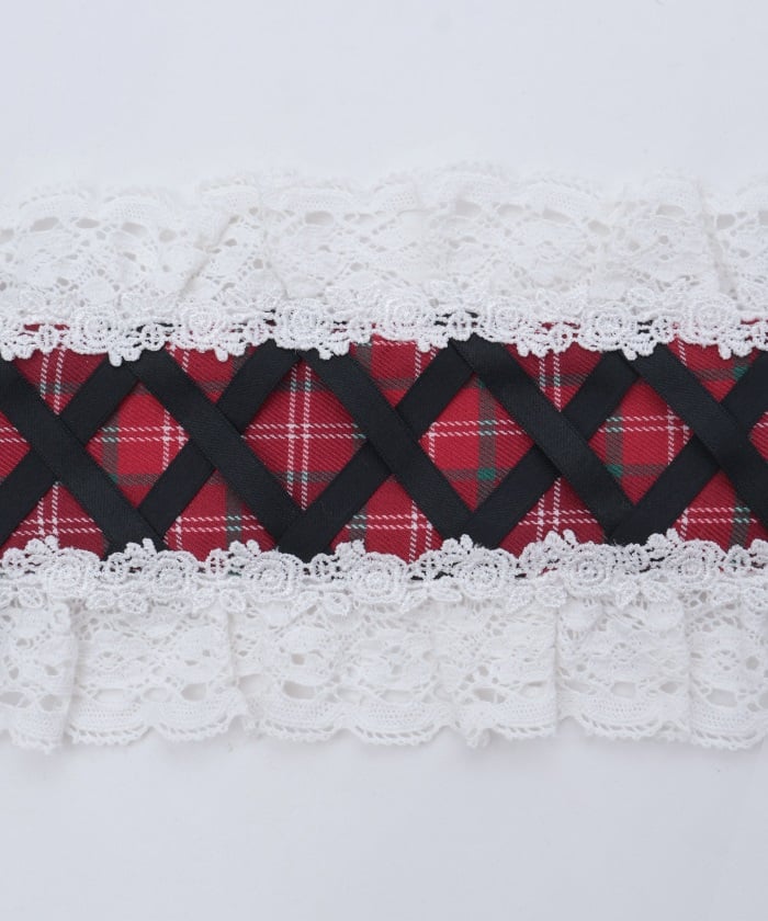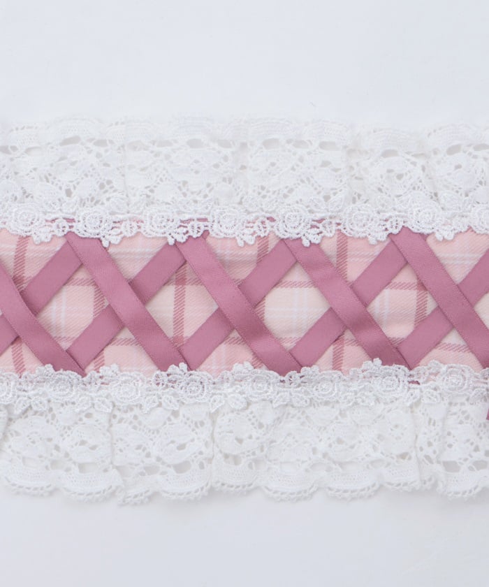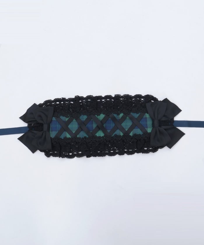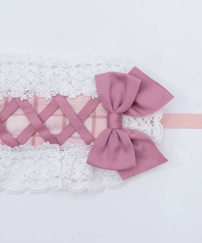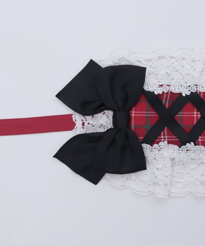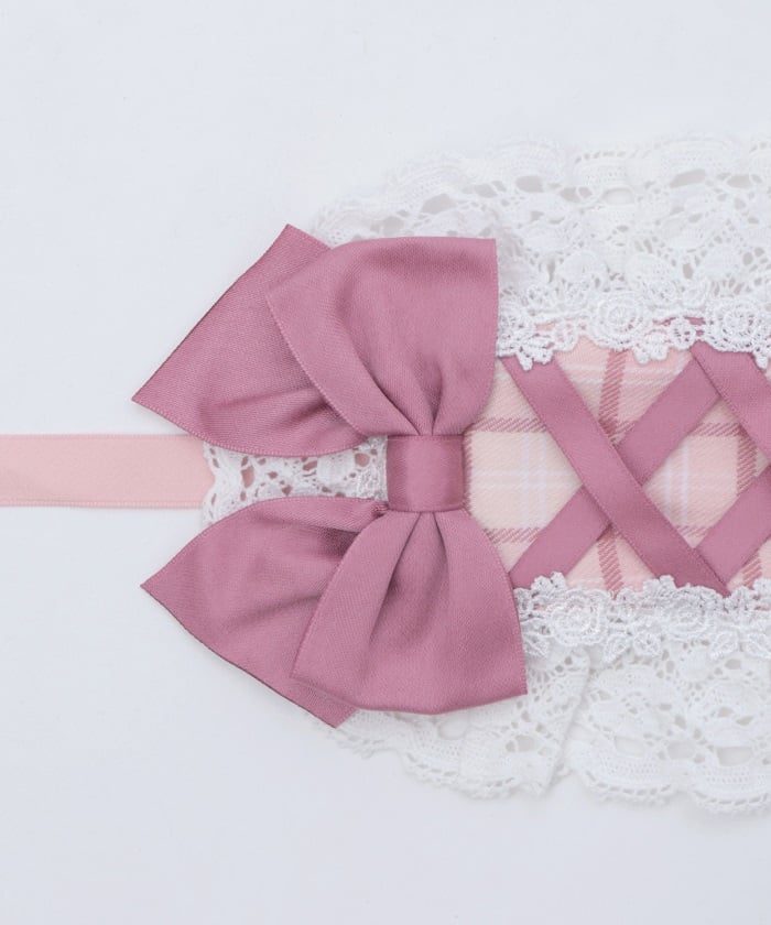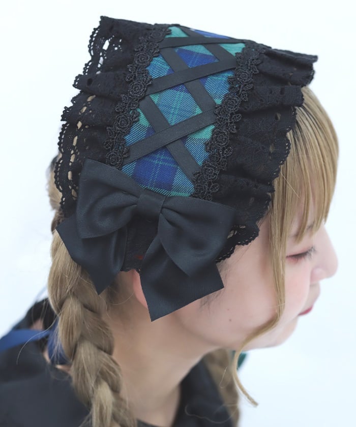 An adorable headdress featuring a lace-up design and torsion lace trims. The large ribbons on either side are also a highlight. Comes with hair clips on the inside for ease of putting on.