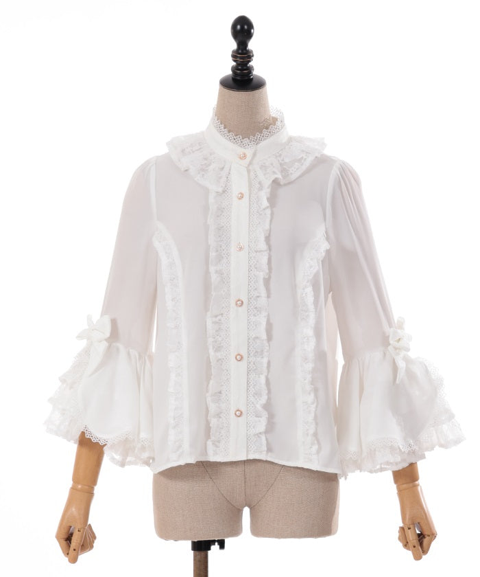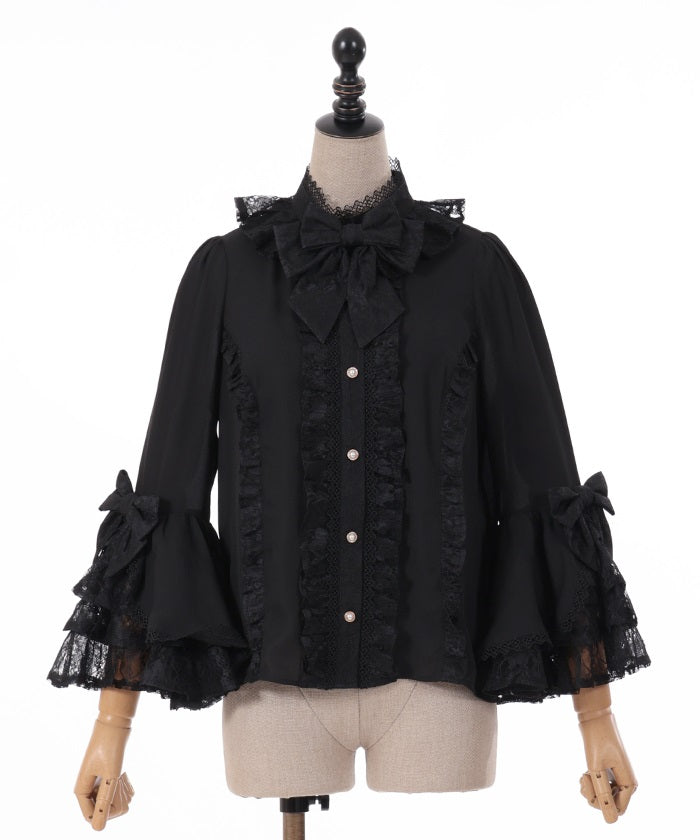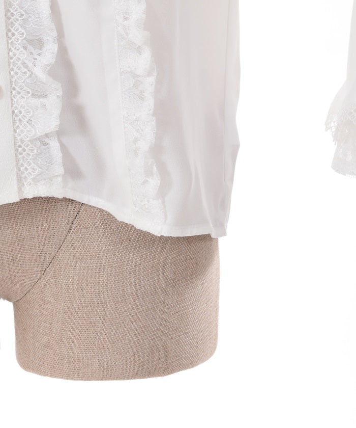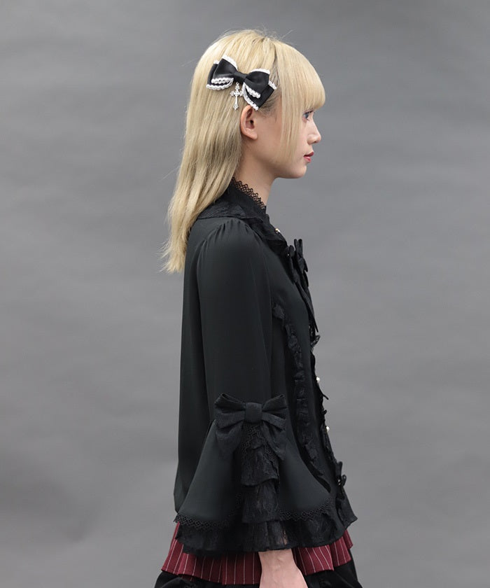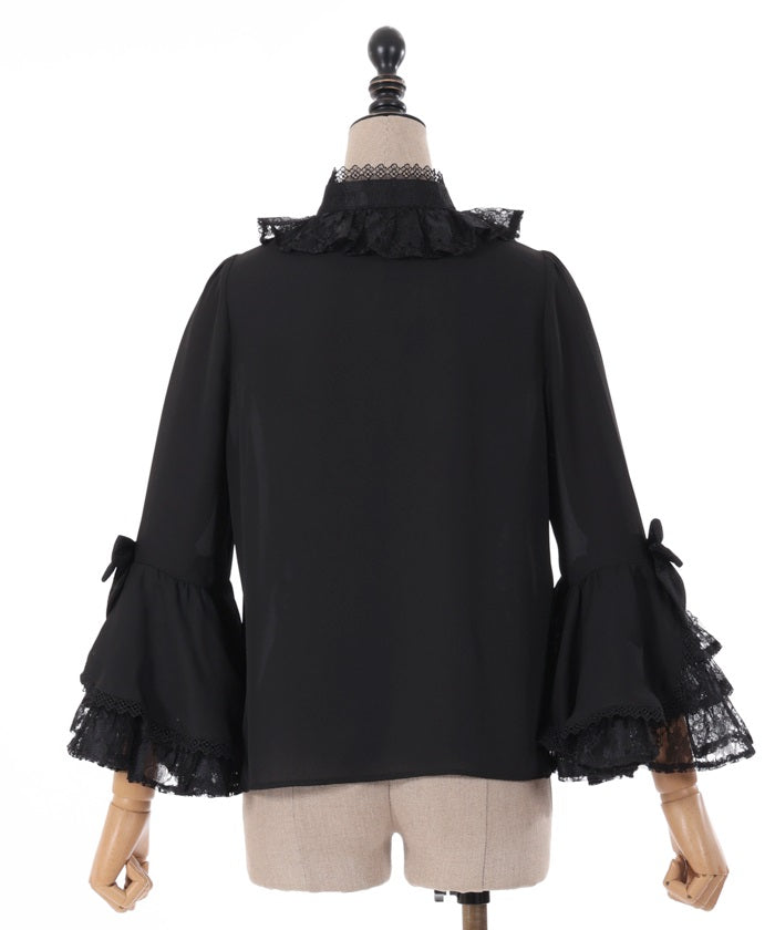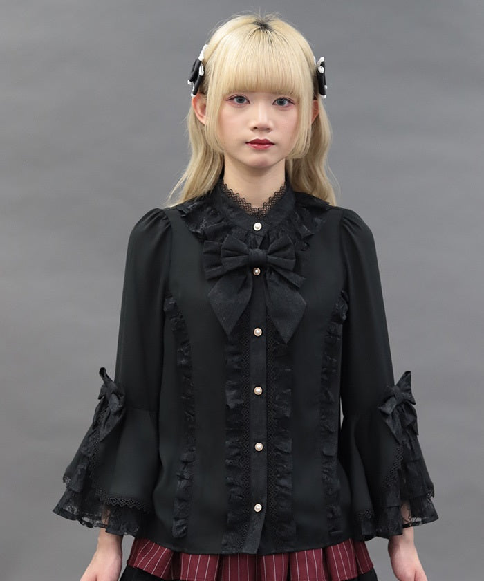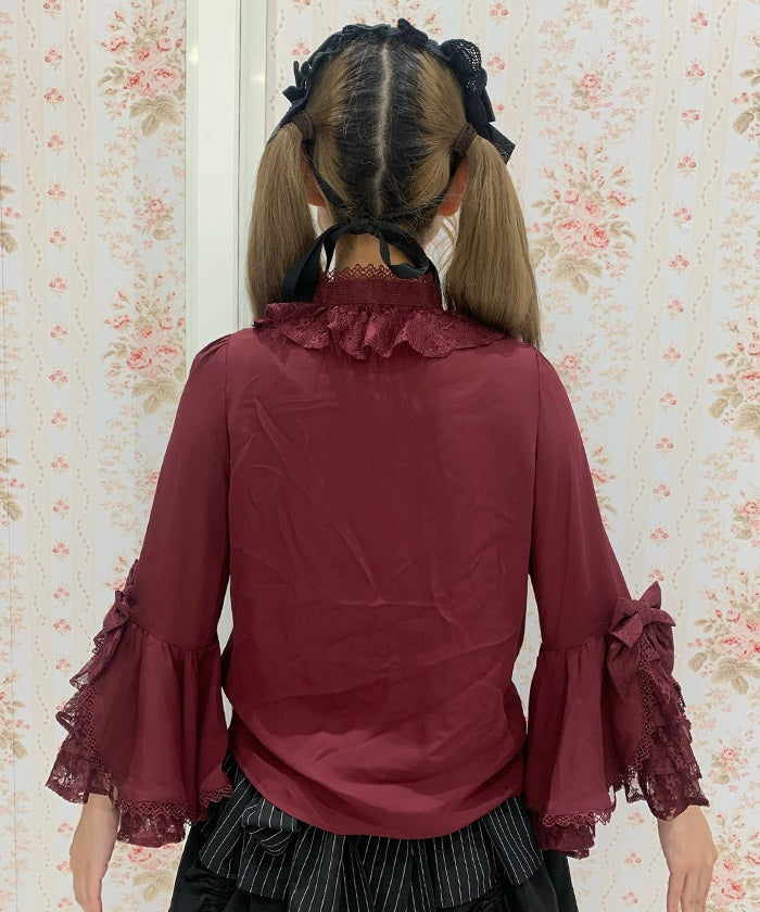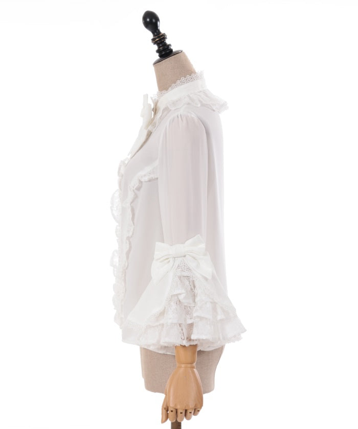 This adorable blouse features sleeves adorned with lace frills. The large ribbon at the neck is a brooch and is removable.