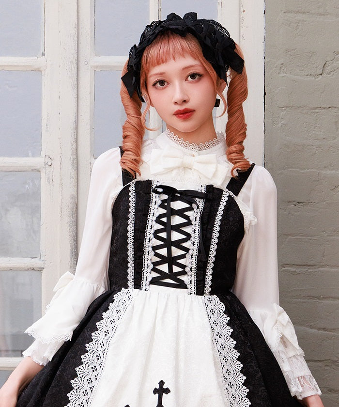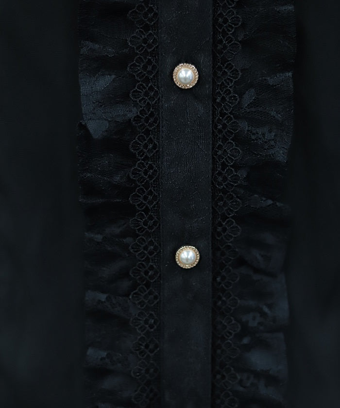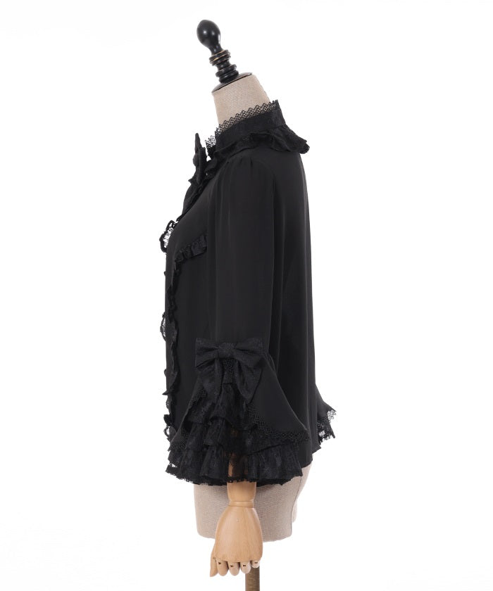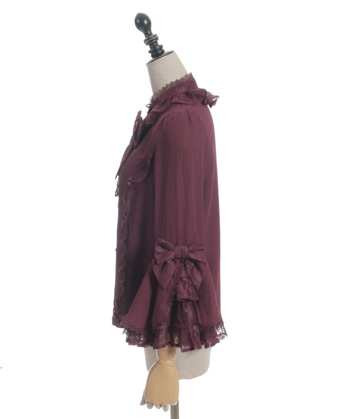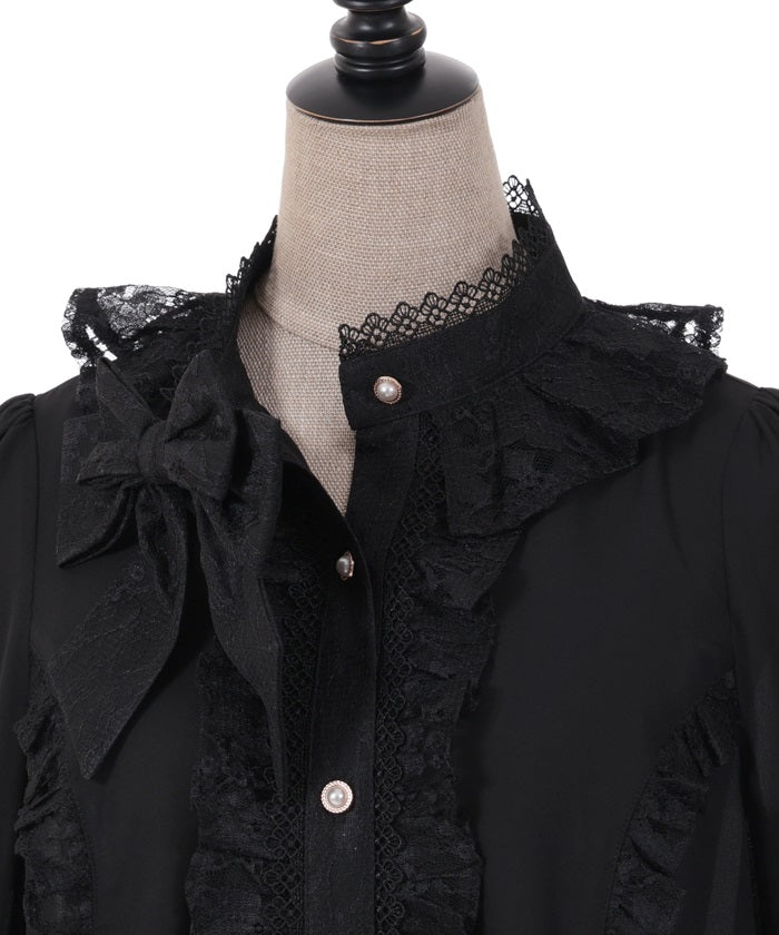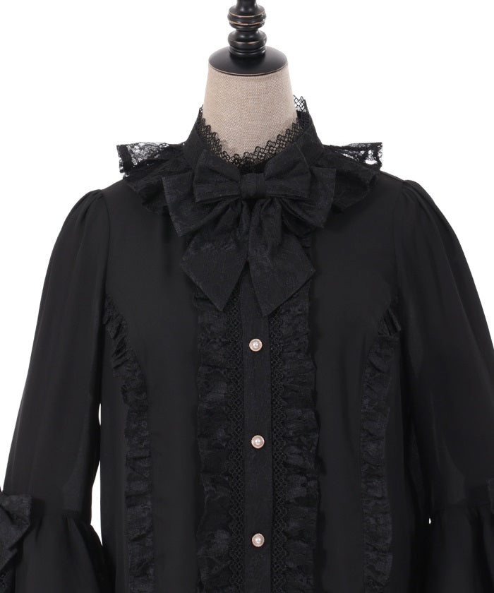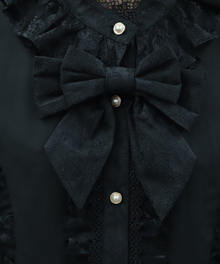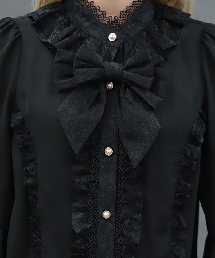 This adorable blouse features sleeves adorned with lace frills. The large ribbon at the neck is a brooch and is removable.