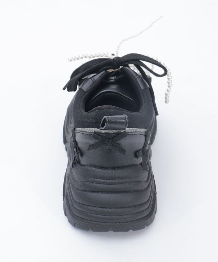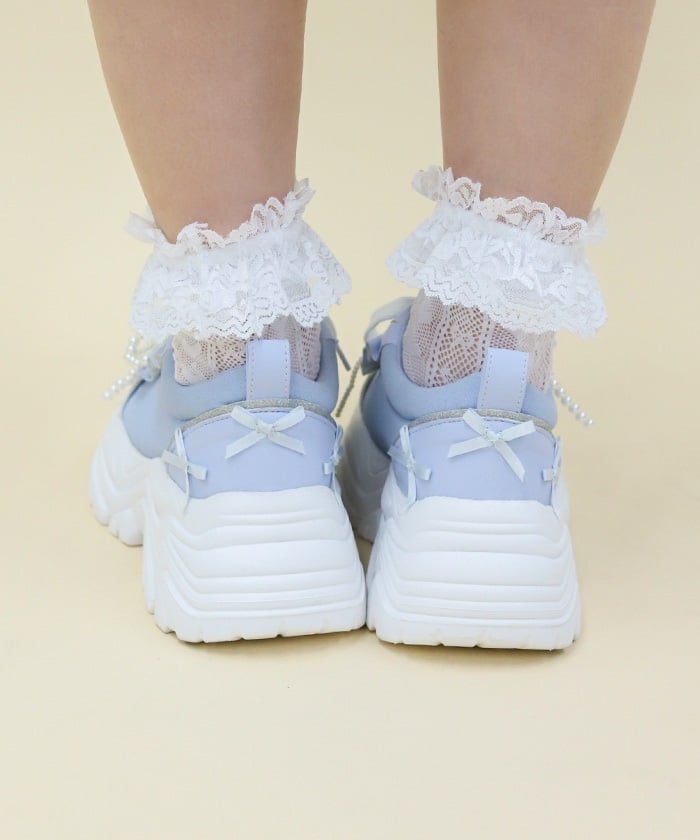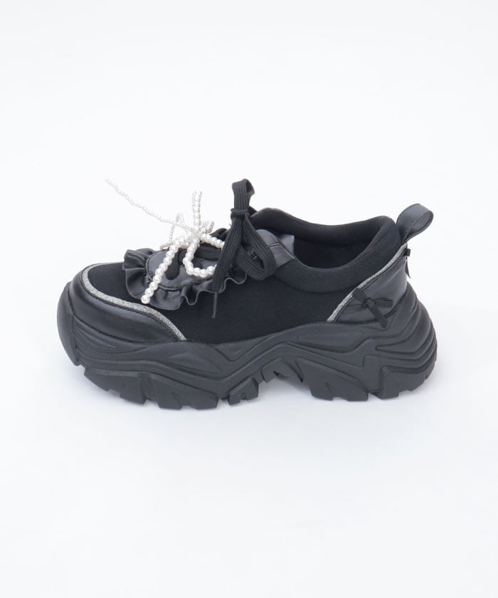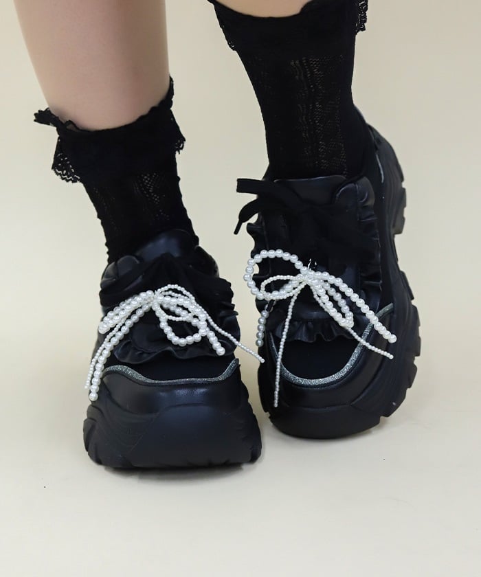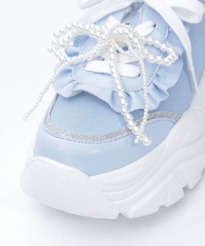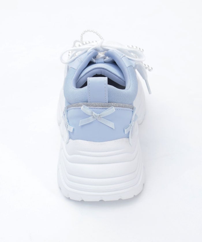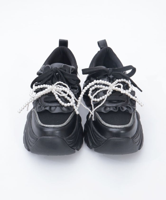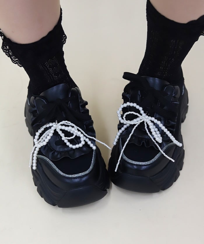 Platform sneakers with pearl ribbon charms.