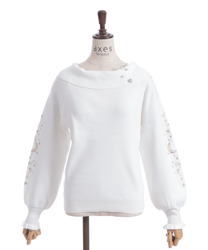 A knit top featuring glittery lamé thread embroidery on the sleeves.