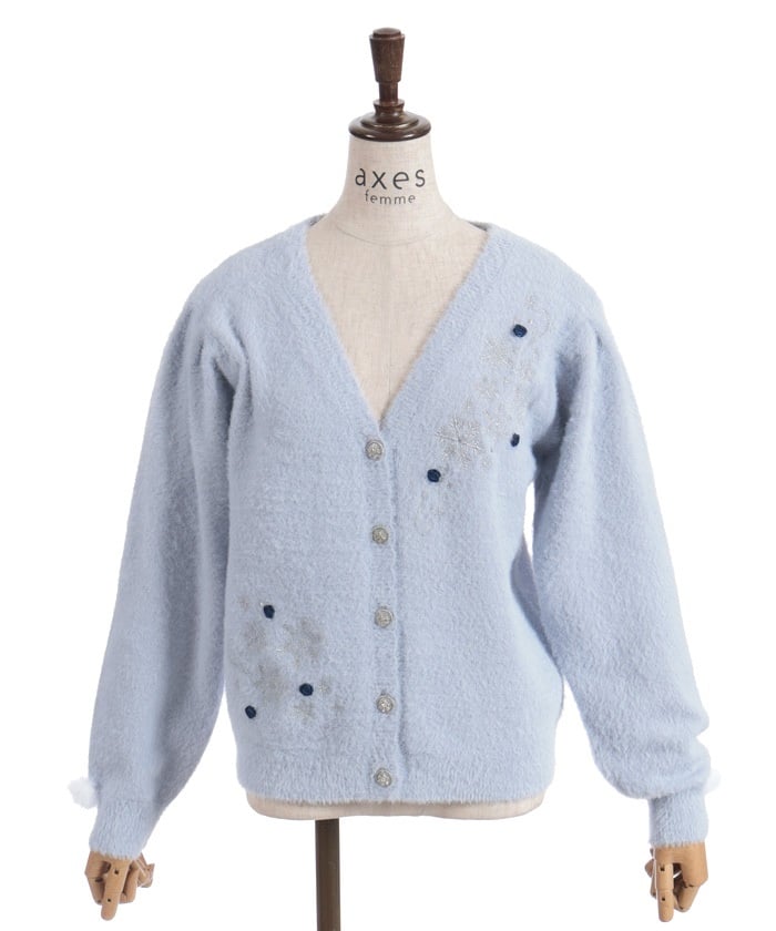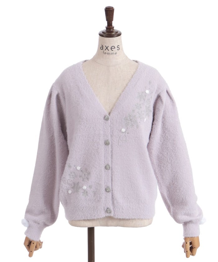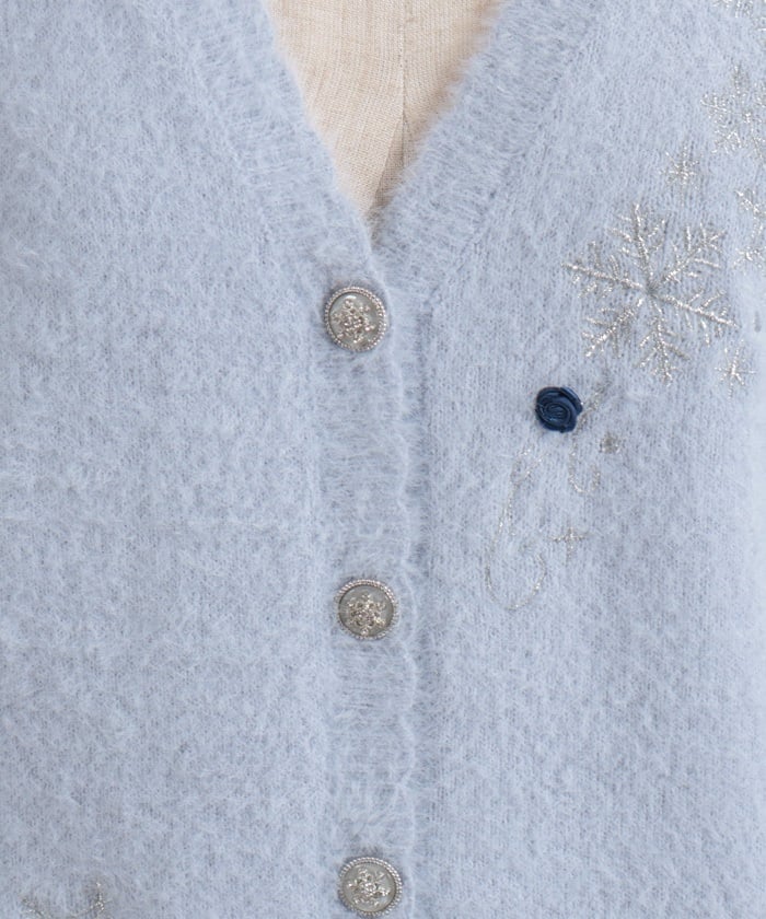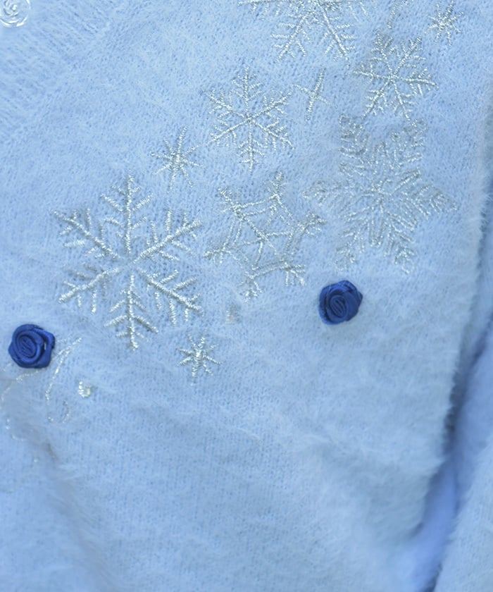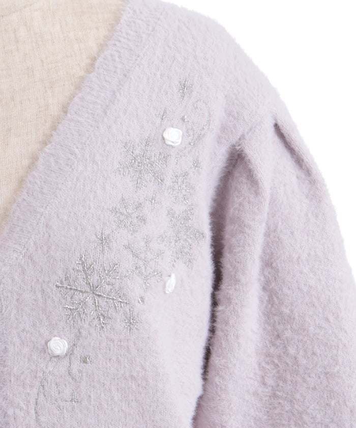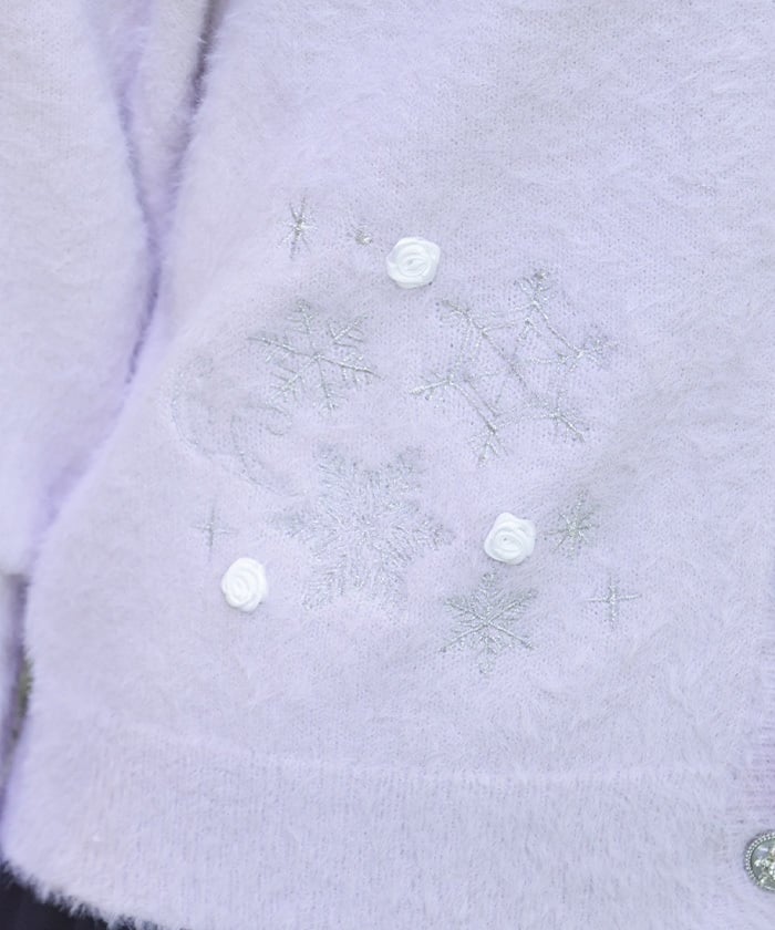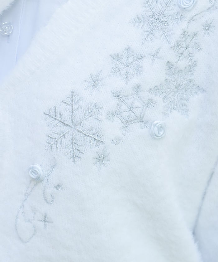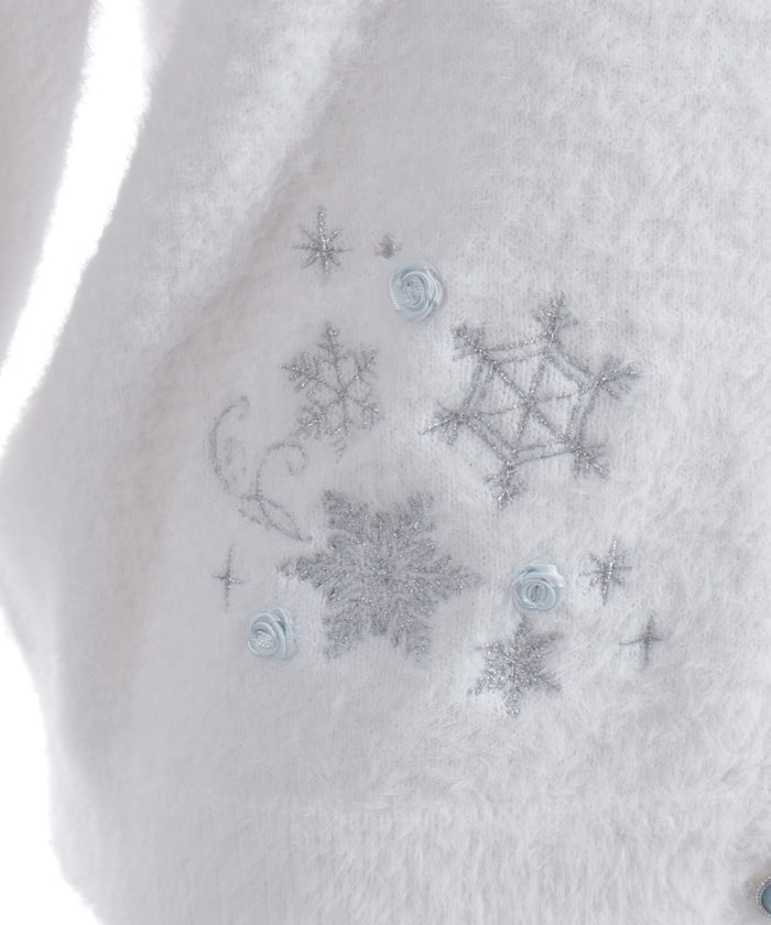 A fluffy feather knit cardigan adorned with captivating snowflake embroidery made from sparkly glitter yarn.