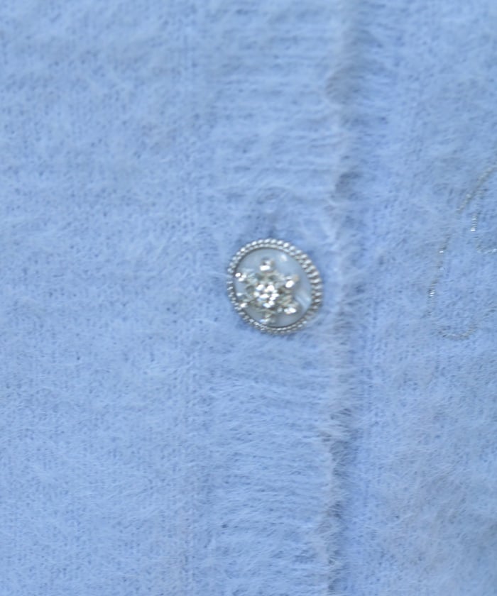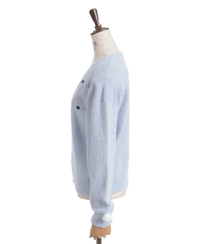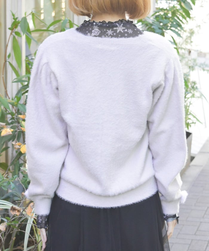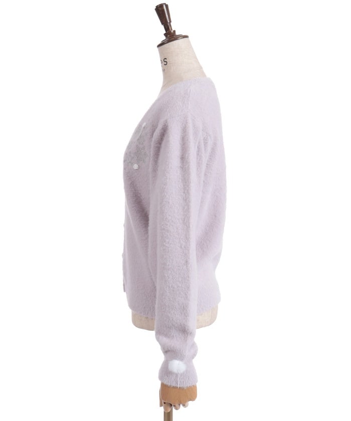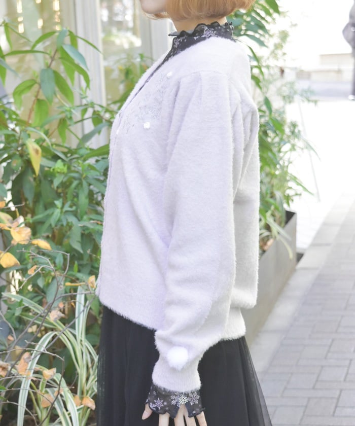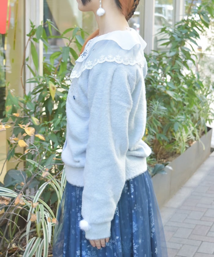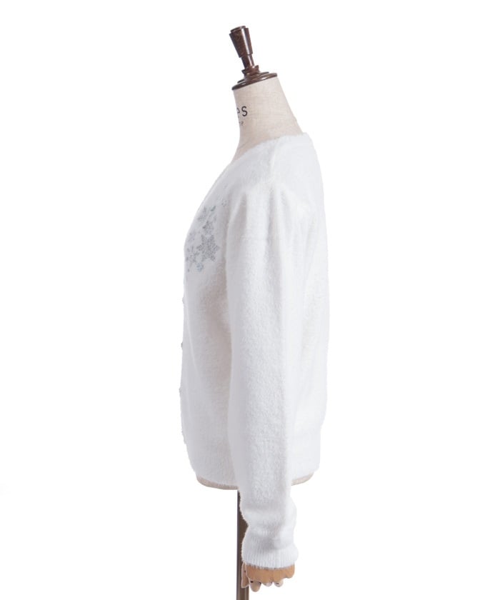 A fluffy feather knit cardigan adorned with captivating snowflake embroidery made from sparkly glitter yarn.