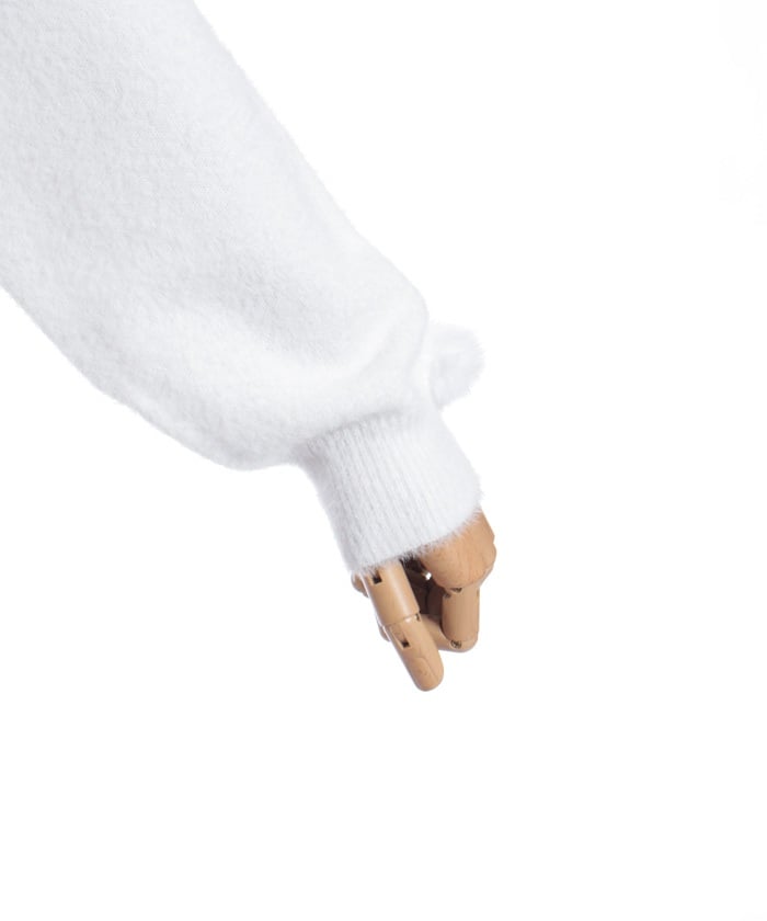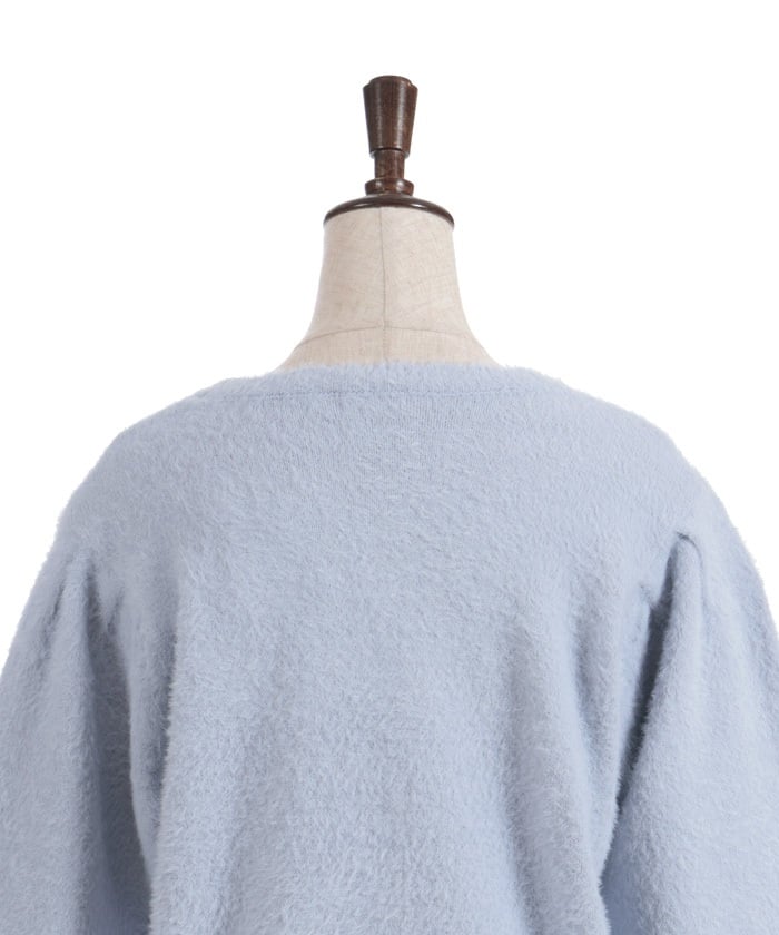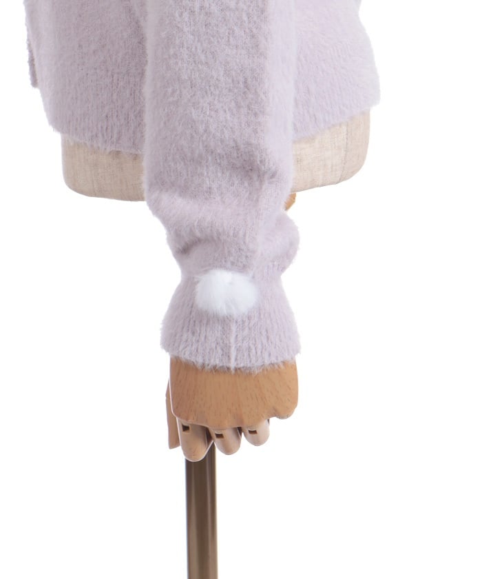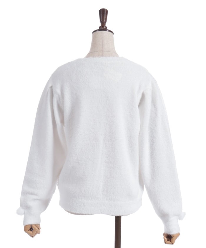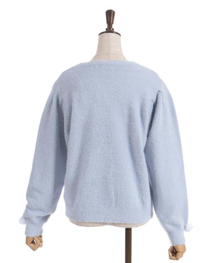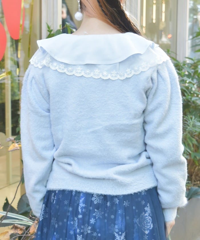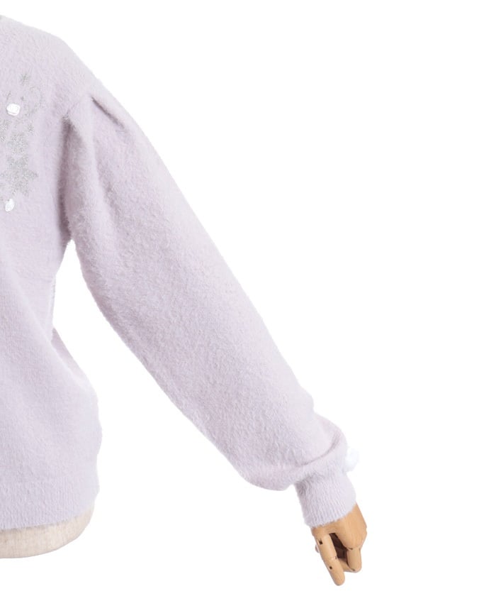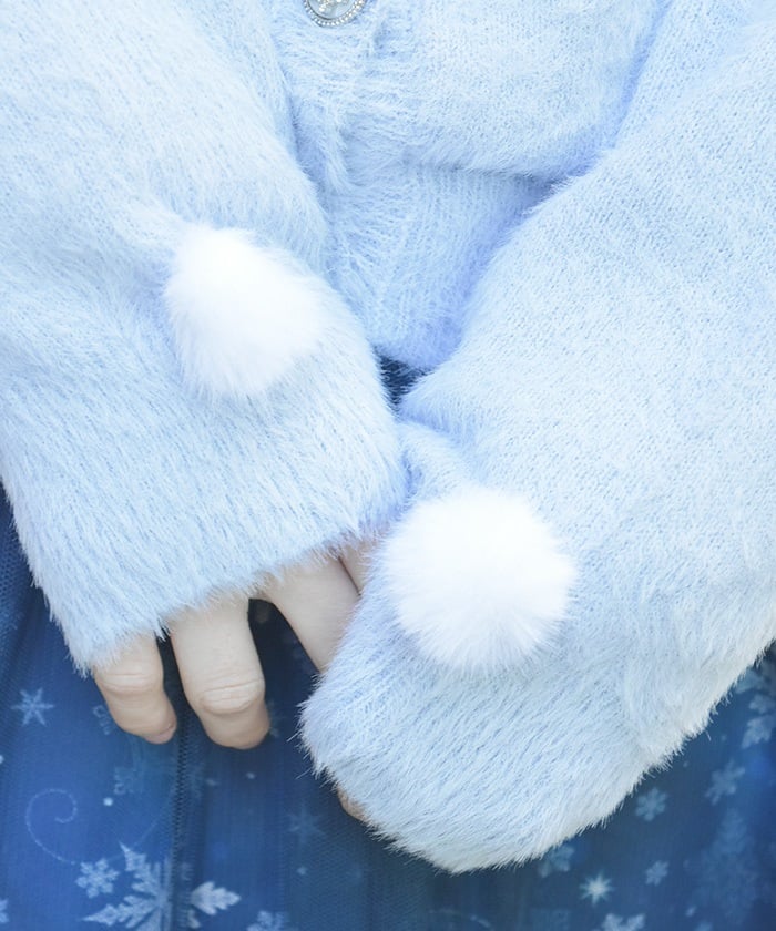 A fluffy feather knit cardigan adorned with captivating snowflake embroidery made from sparkly glitter yarn.