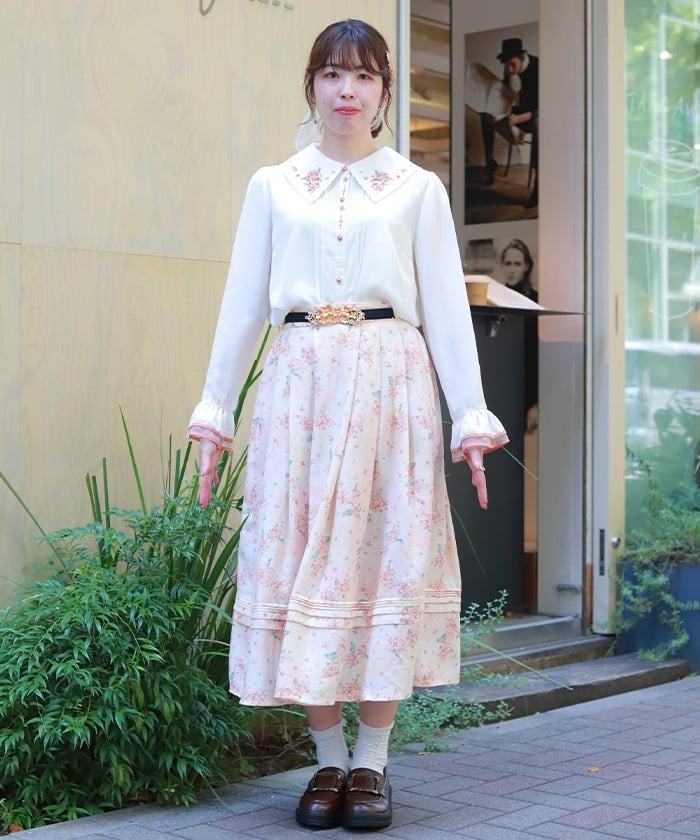 This piece is color-coordinated with Kinmokusei Embroidery Collar Blouse and Kinmokusei Embroidery Knit Cardigan for a perfectly coordinated look.