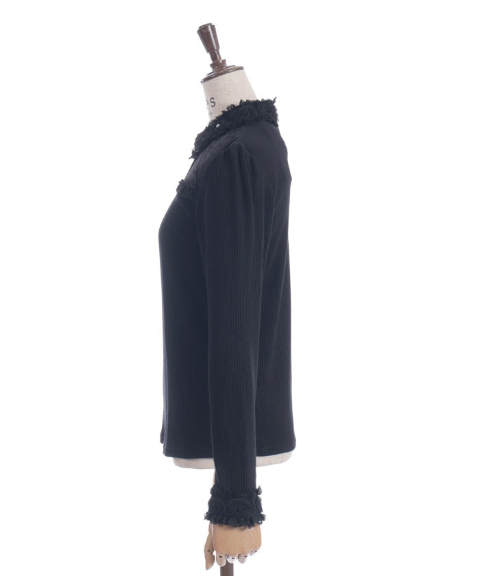 This cut-and-sewn pullover features rose motifs crafted from tulle.