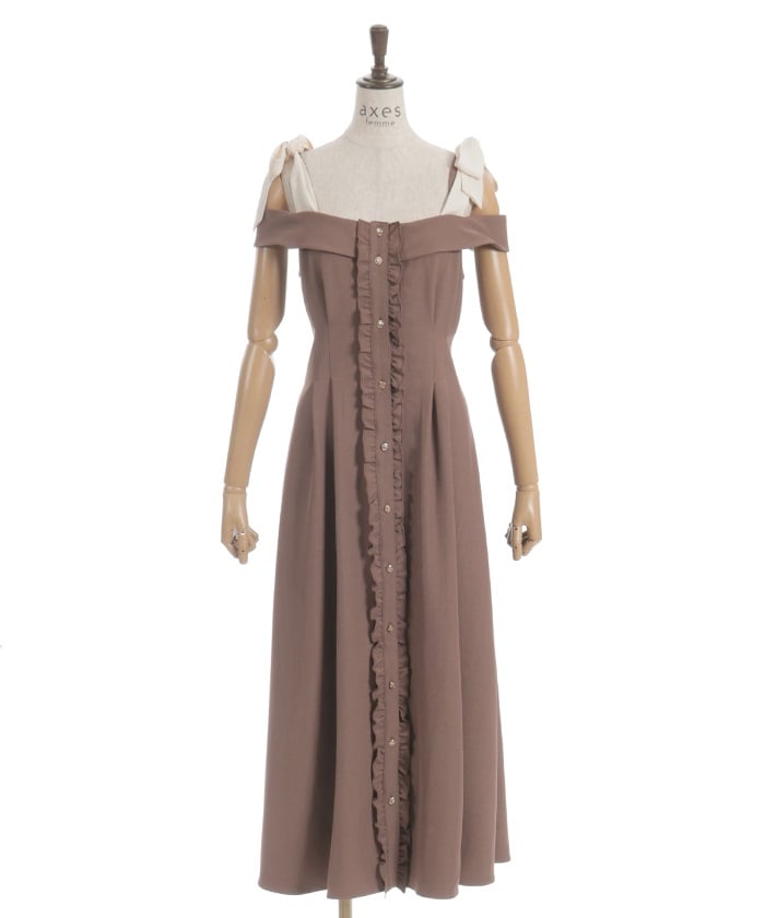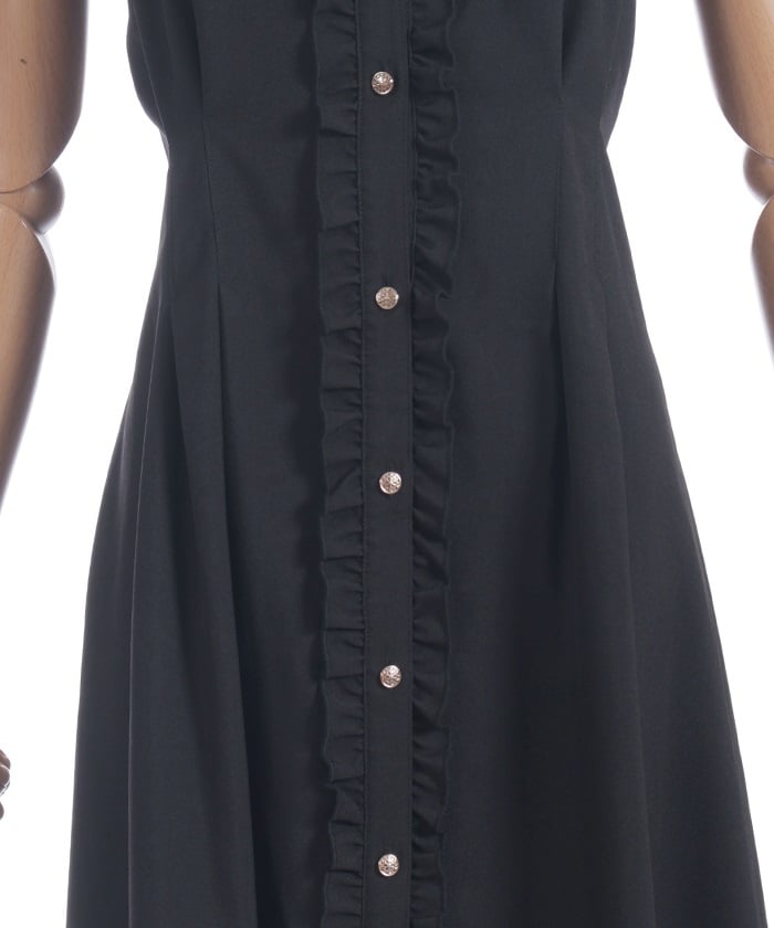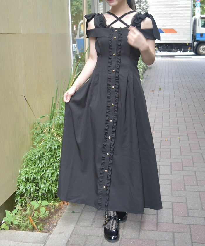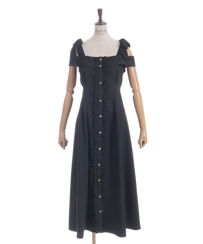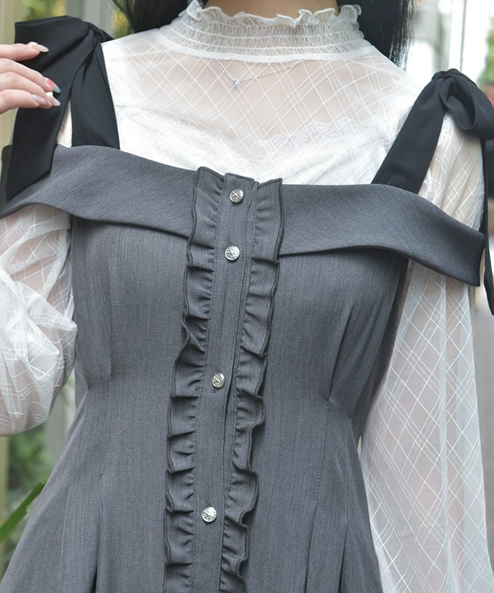 This long dress features a sleek silhouette and relaxed shoulders. The ruffles along the button line add a subtle feminine touch. The shoulder straps feature a self-tie ribbon design, and the soft, flowing ribbon adds a cute accent. This dress looks great worn alone or with an inner layer.