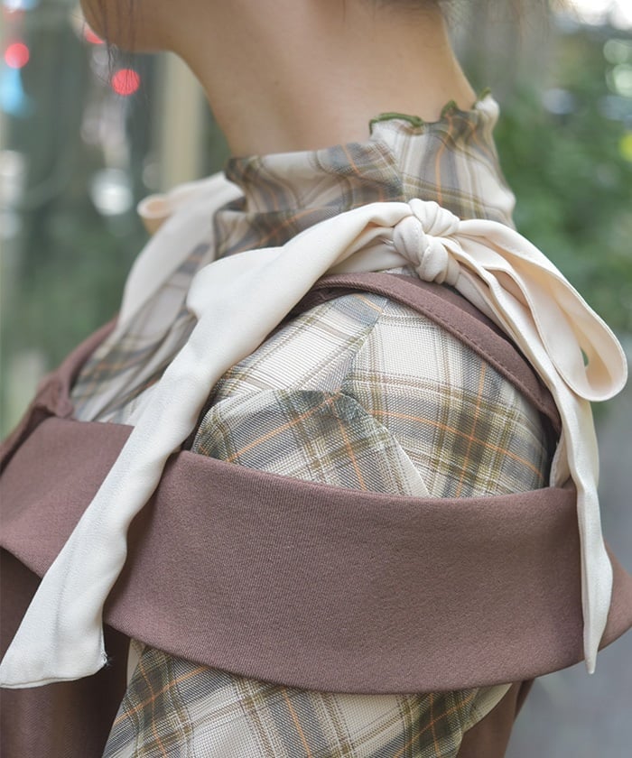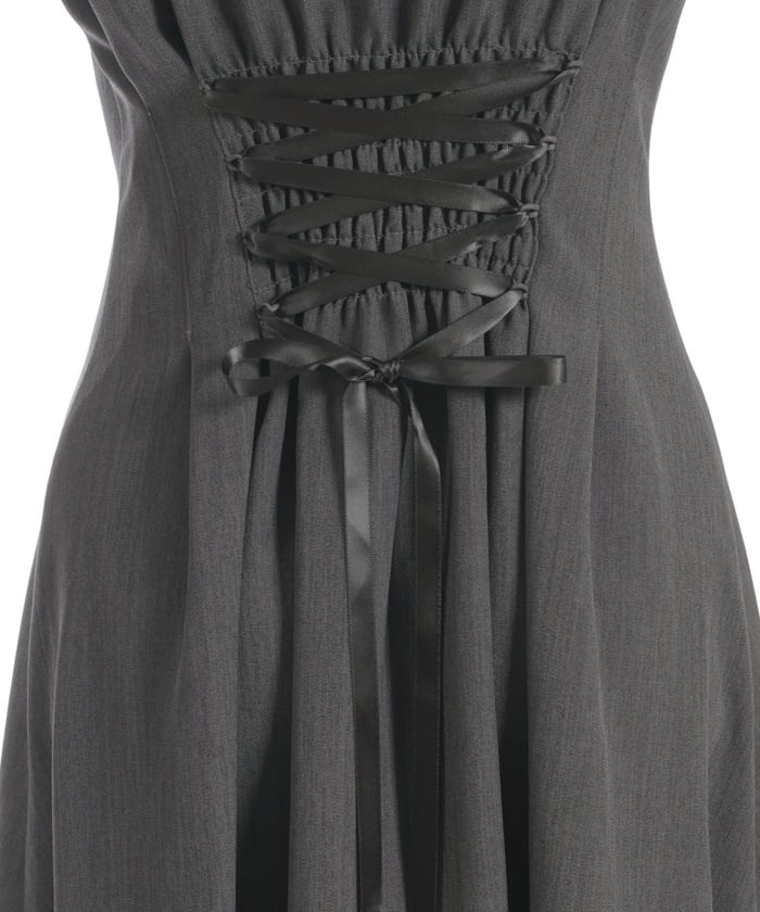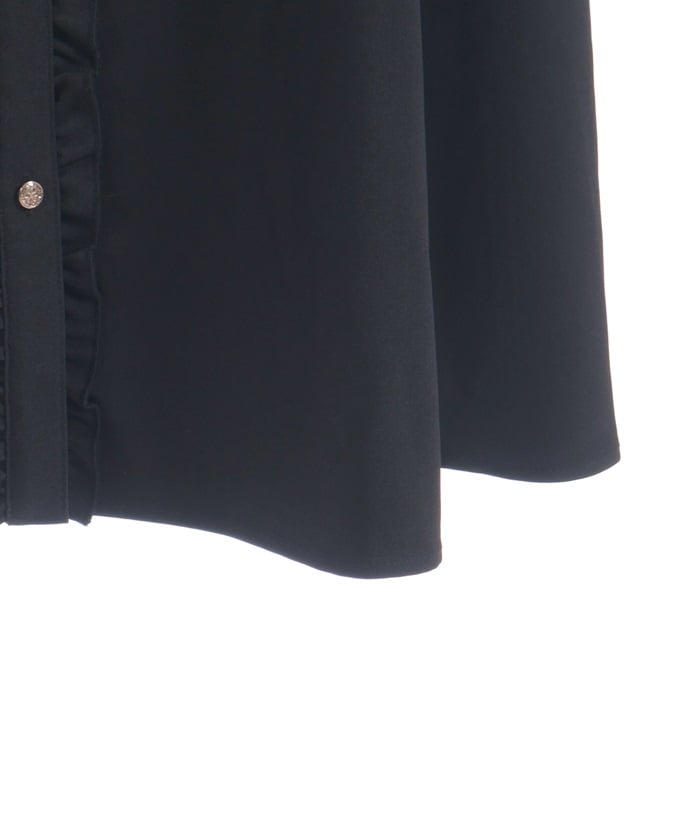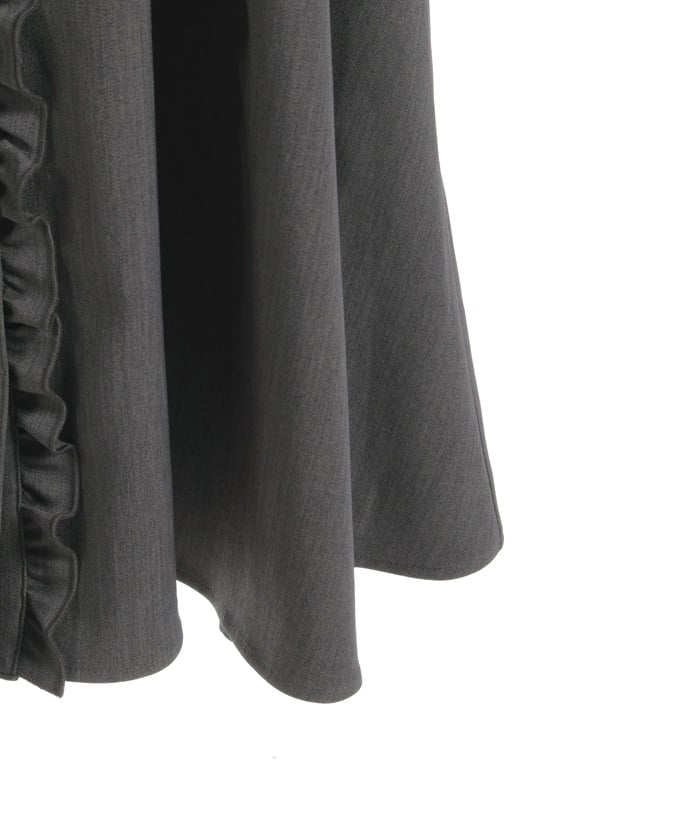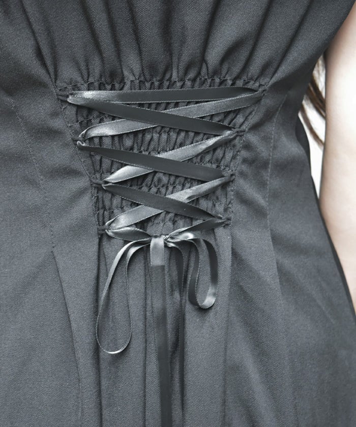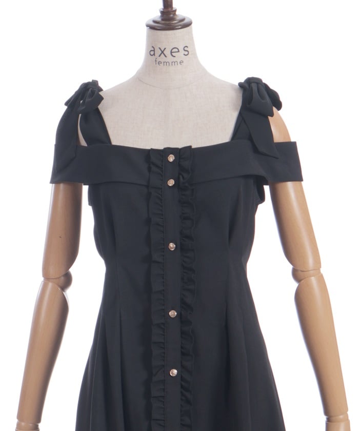 This long dress features a sleek silhouette and relaxed shoulders. The ruffles along the button line add a subtle feminine touch. The shoulder straps feature a self-tie ribbon design, and the soft, flowing ribbon adds a cute accent. This dress looks great worn alone or with an inner layer.