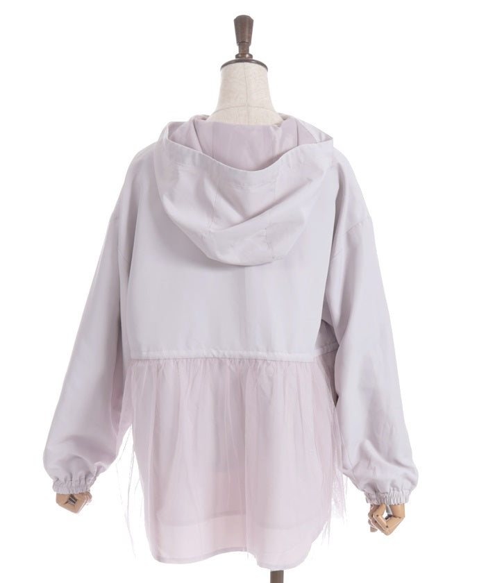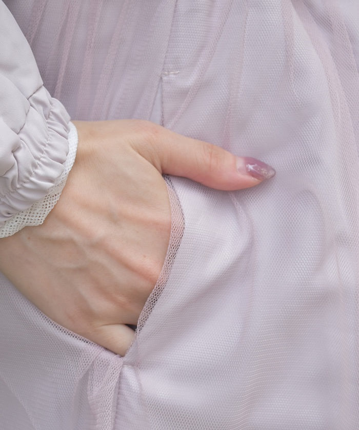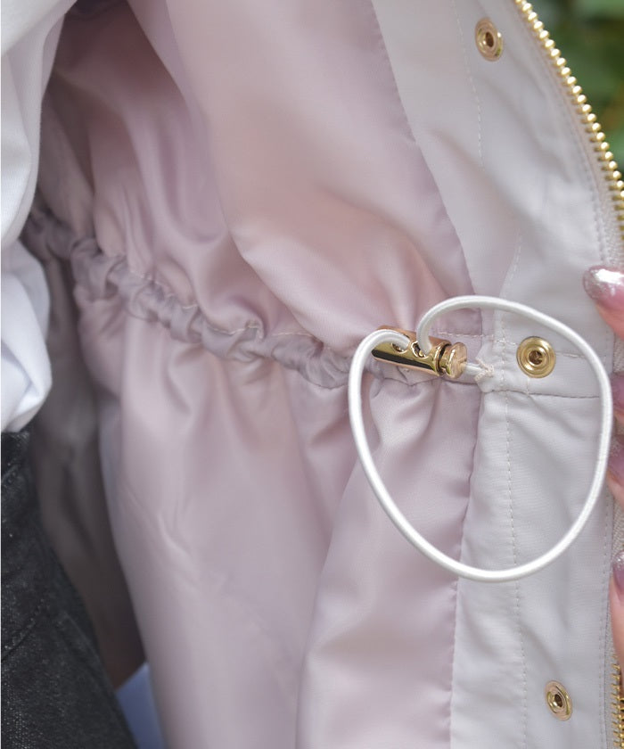 The hood strings are made of shiny, casual grosgrain ribbon, with dangling pearls at the end for a stylish touch.