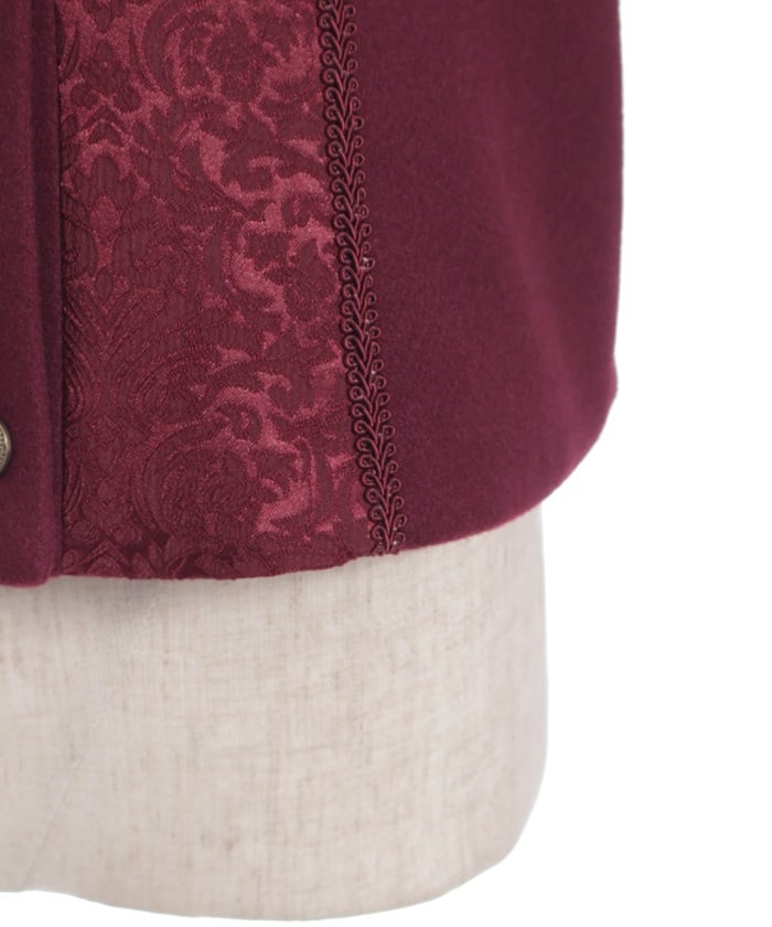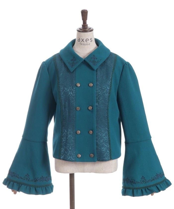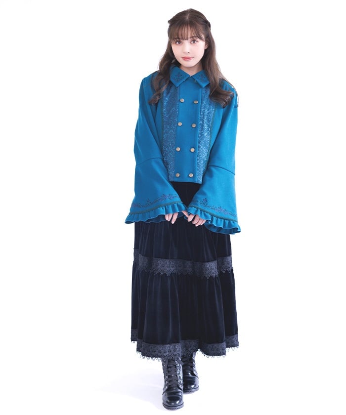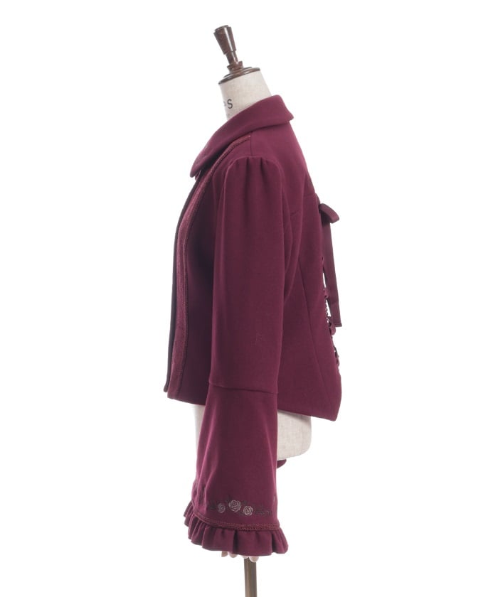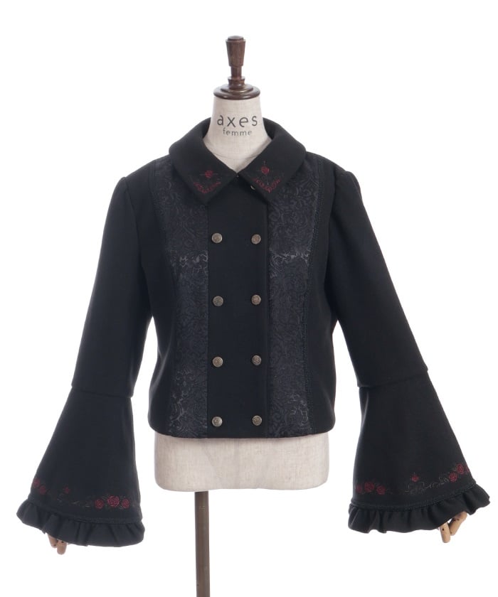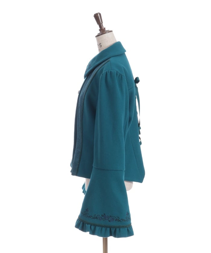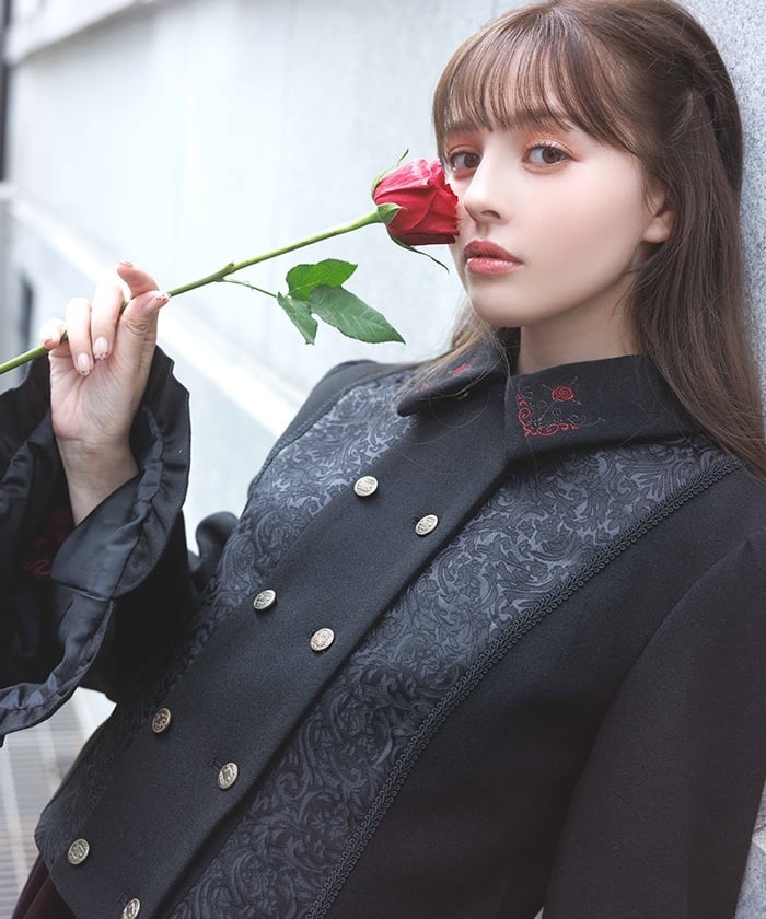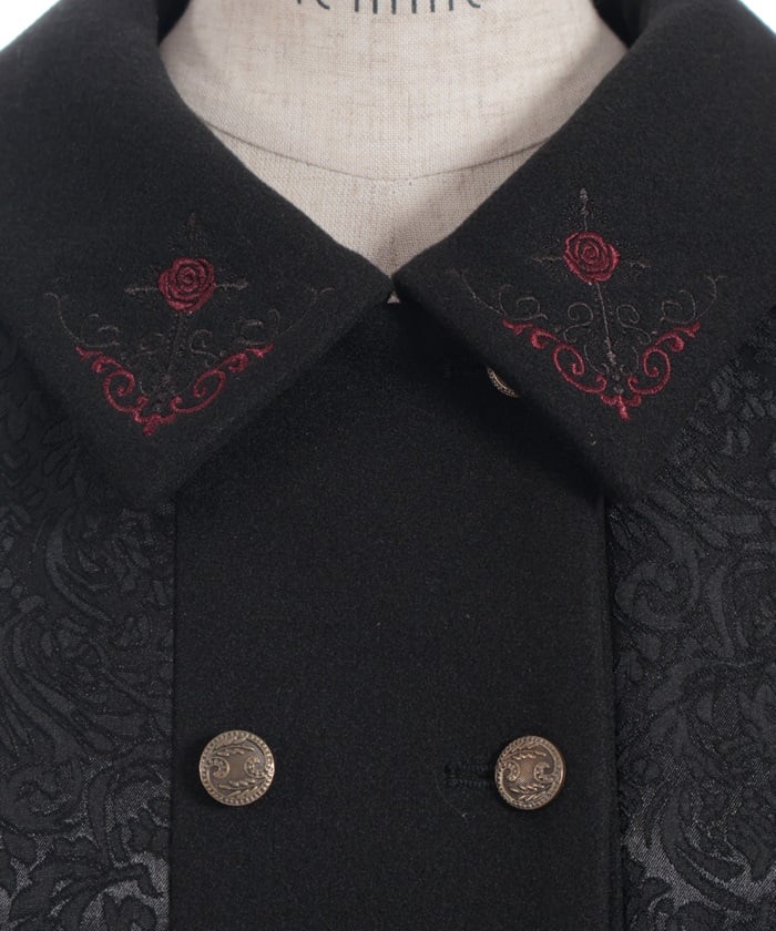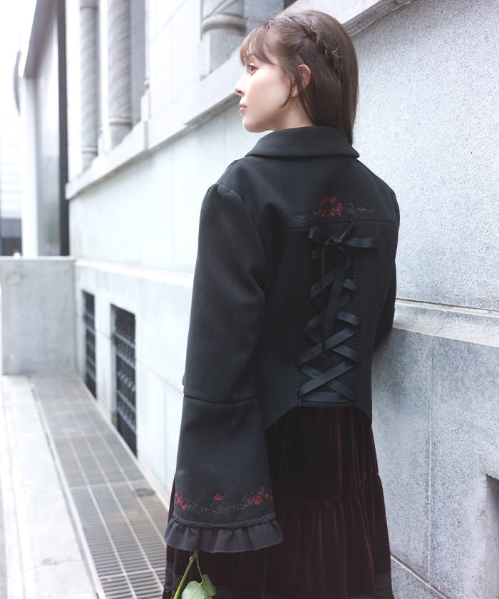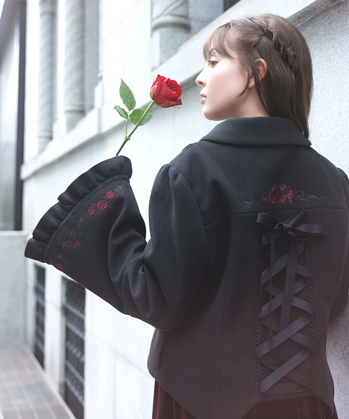 A striking coat featuring embroidered roses, ornaments, and keyhole motifs on the collar, cuffs, and back. The lace-up back design makes it flattering from any angle.