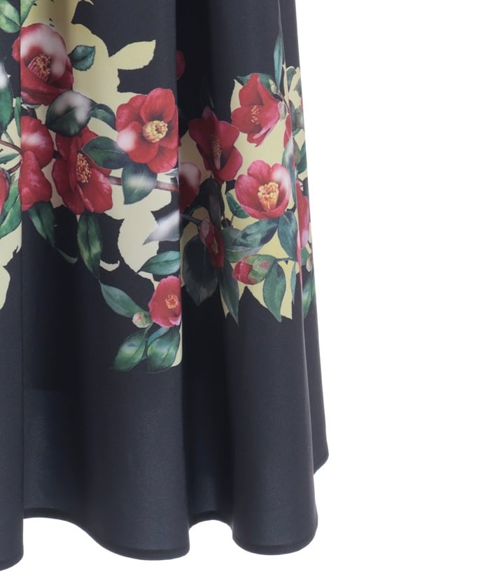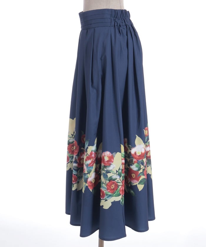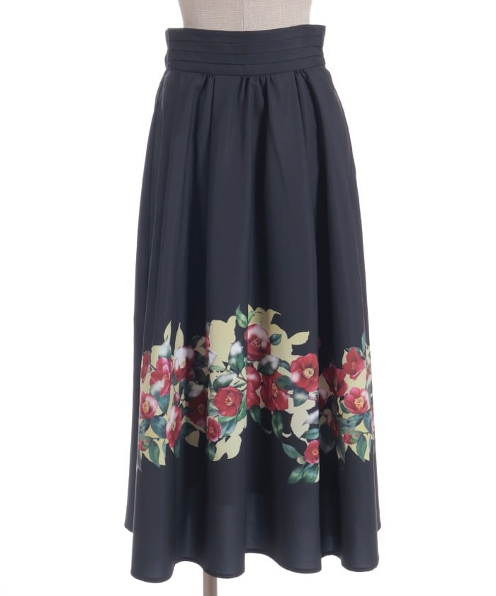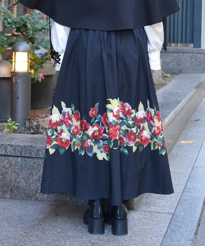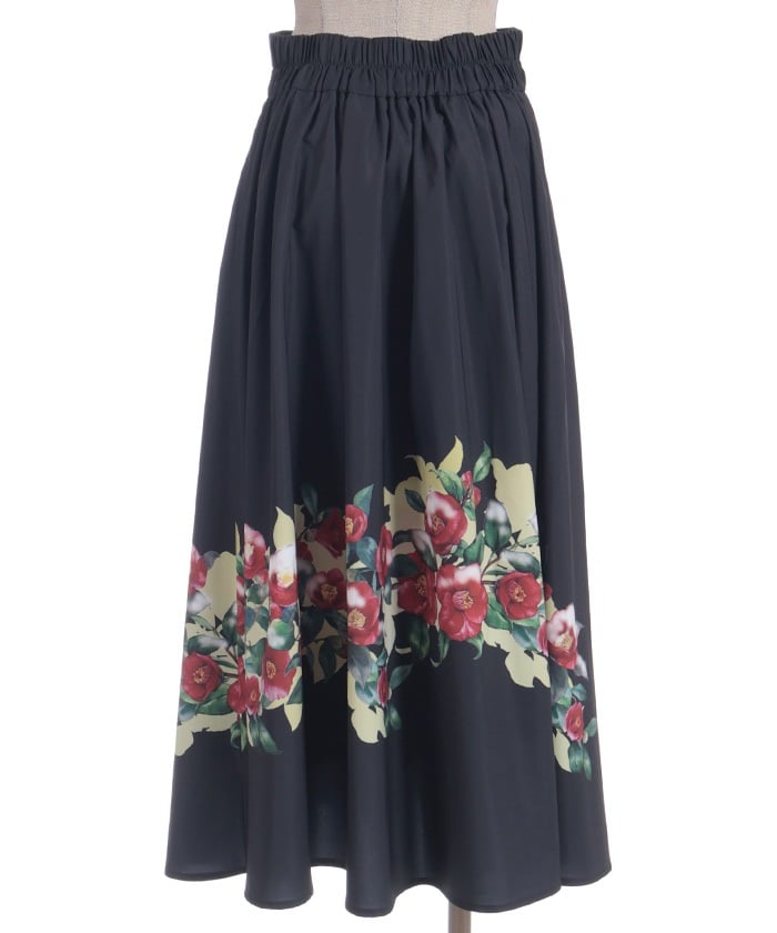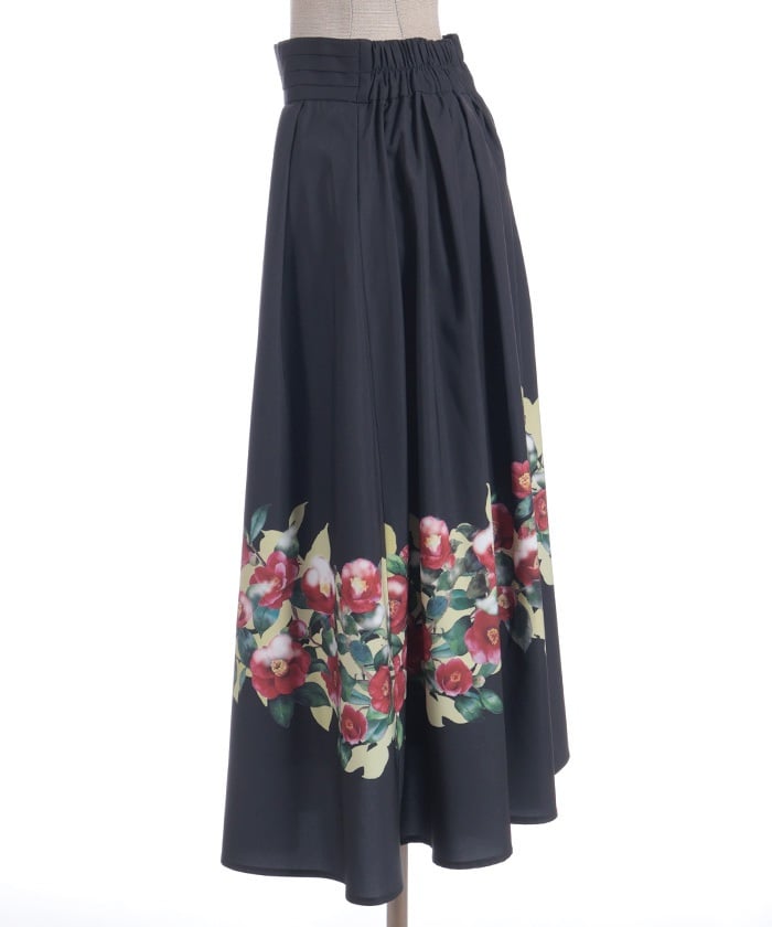 This striking skirt features an original print inspired by camellias painted on a folding screen.
