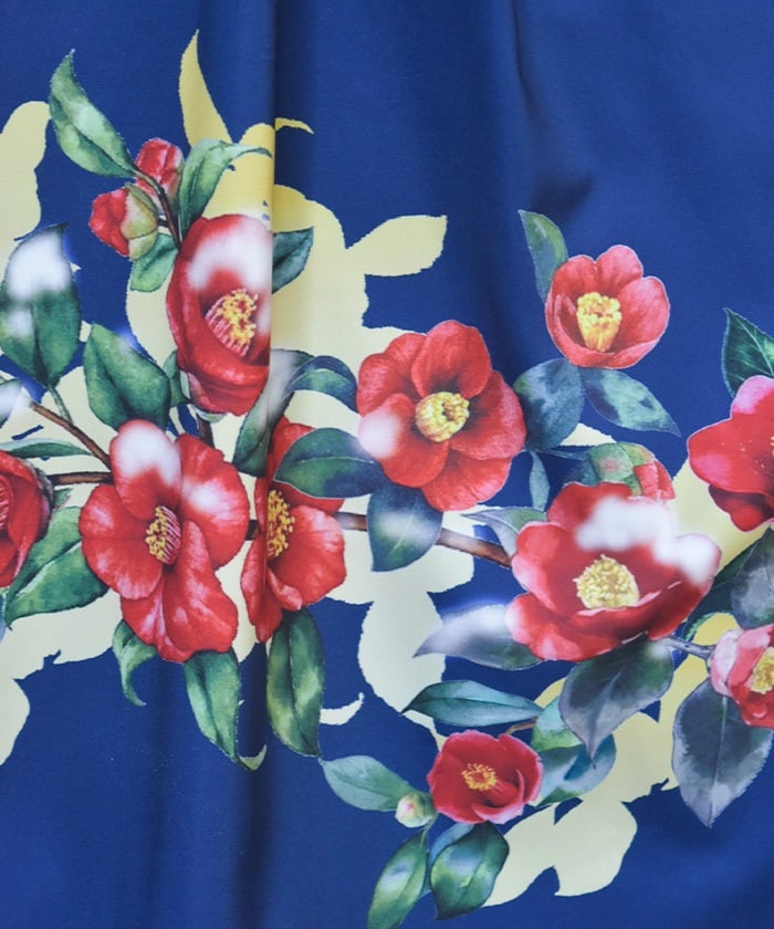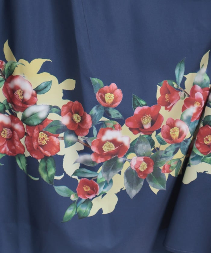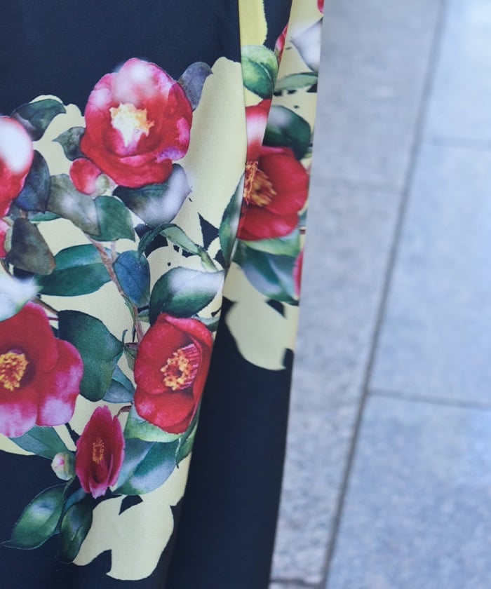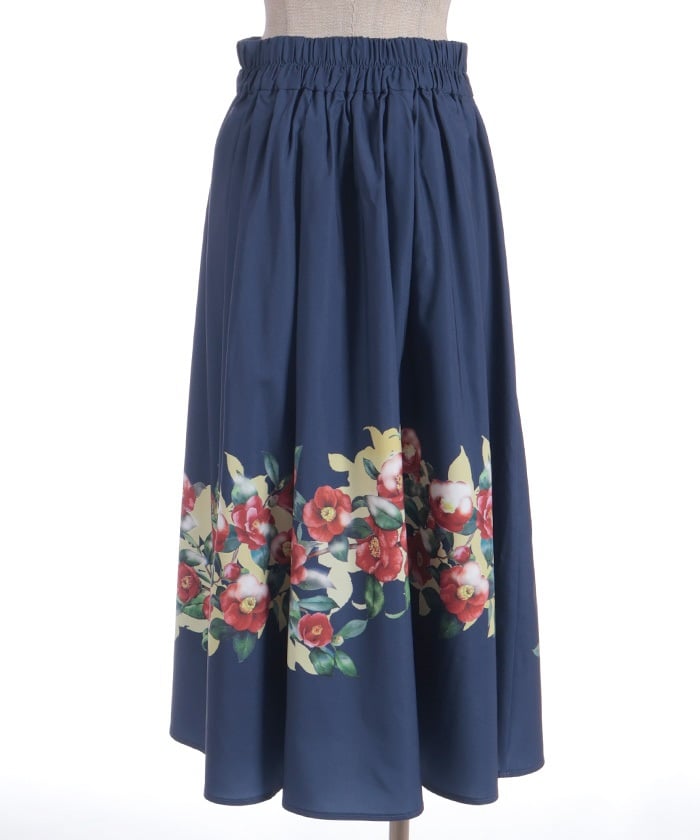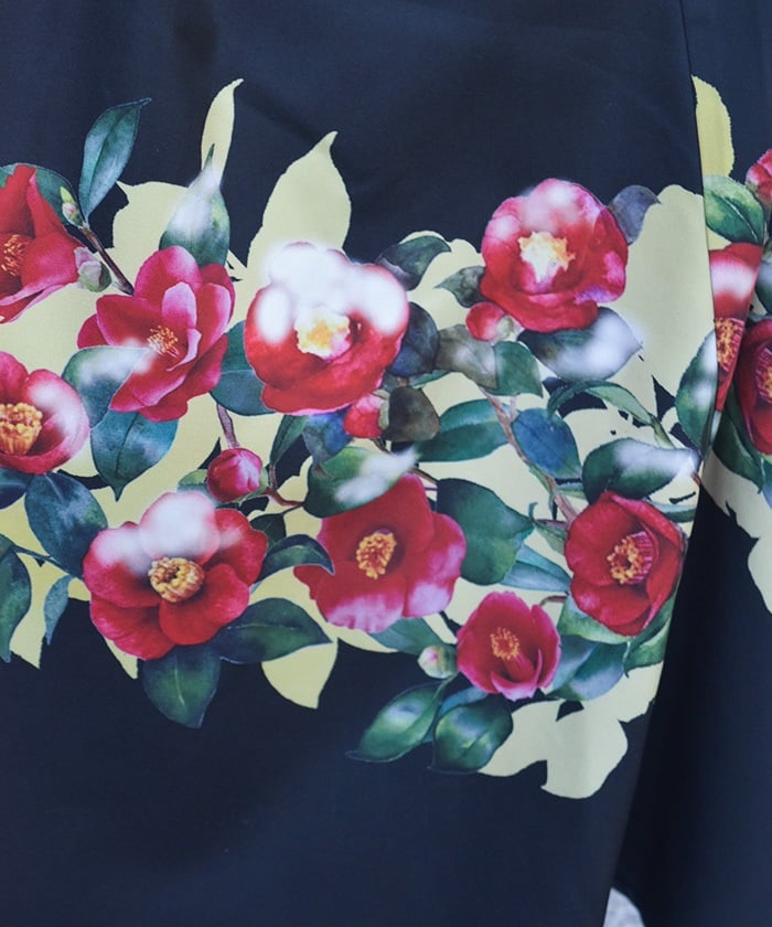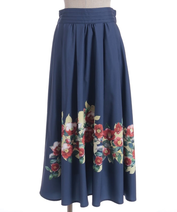 This striking skirt features an original print inspired by camellias painted on a folding screen.