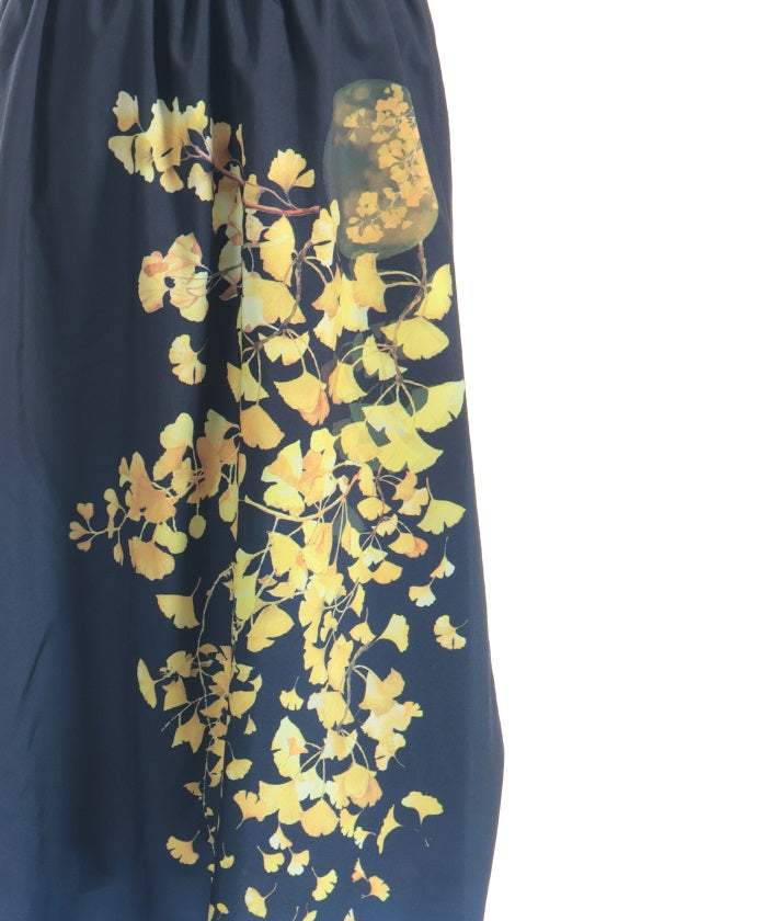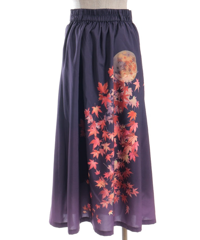 This art print skirt features maple and ginkgo leaves, evocative of autumn in Japan. The moon floating in the tranquil night sky and fluttering leaves create a striking image, reminiscent of a Japanese painting.