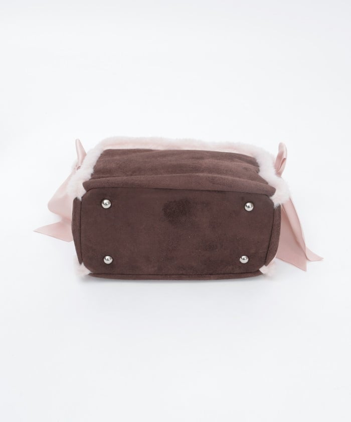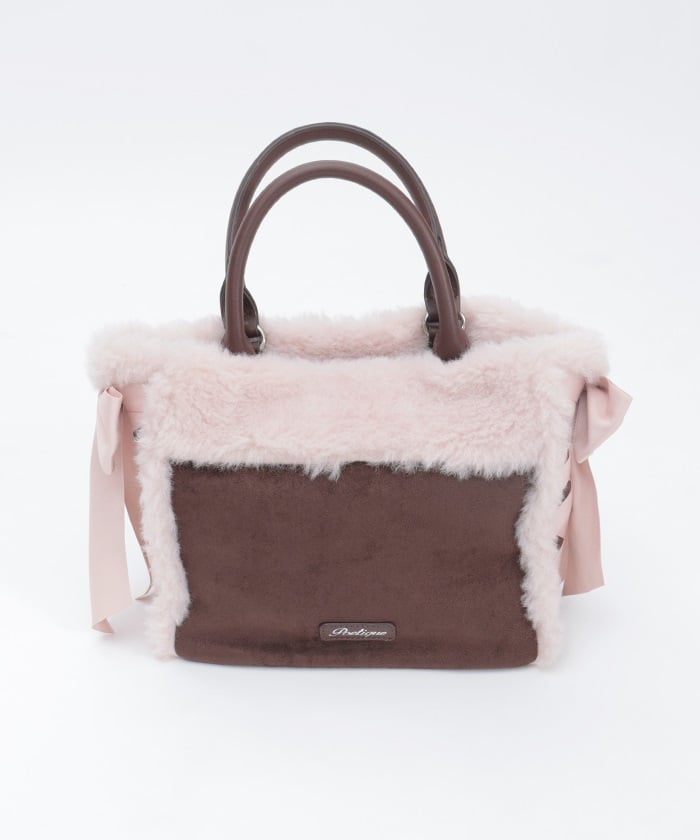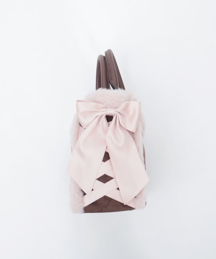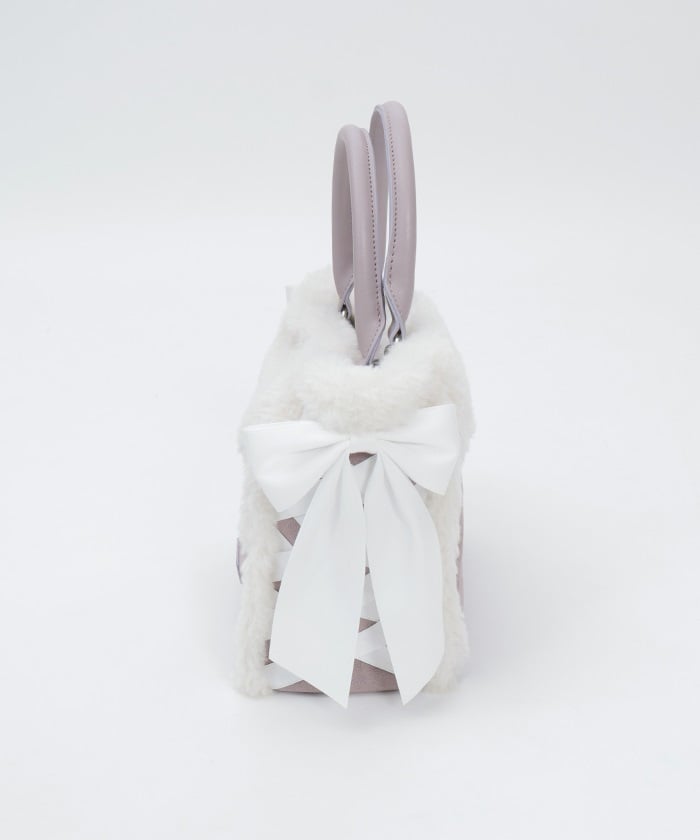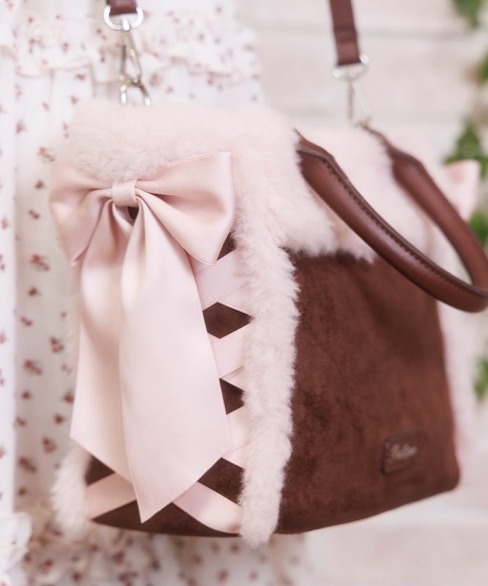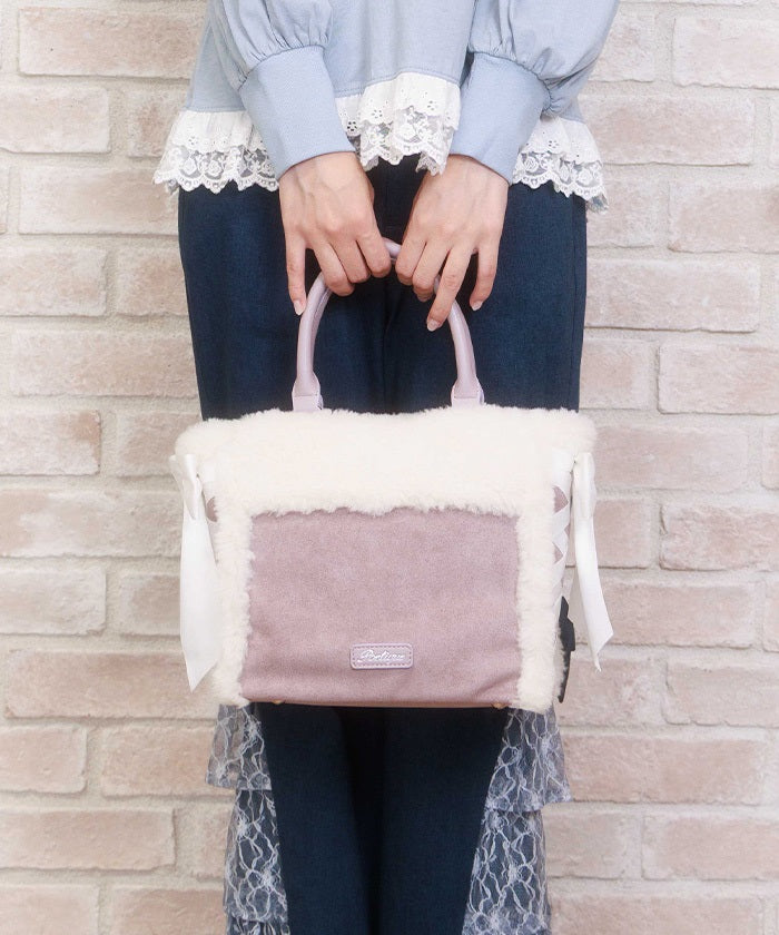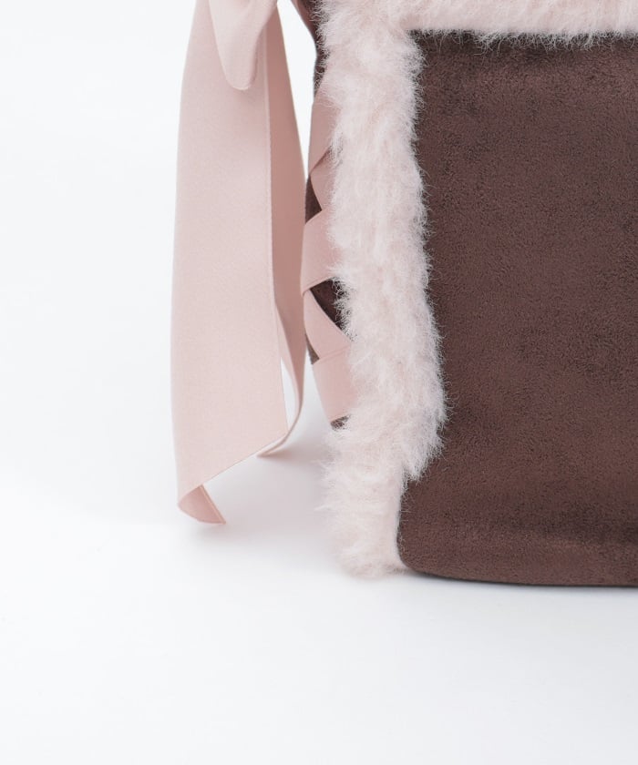 This bag features fluffy bicolor fur and lace-up ribbons on both sides.