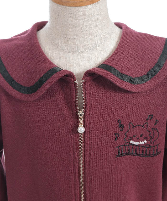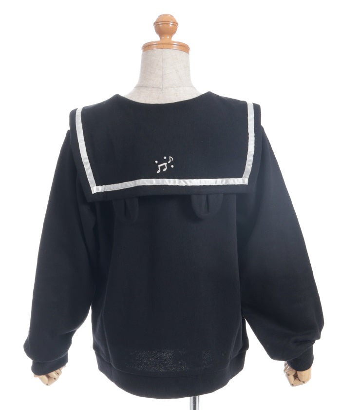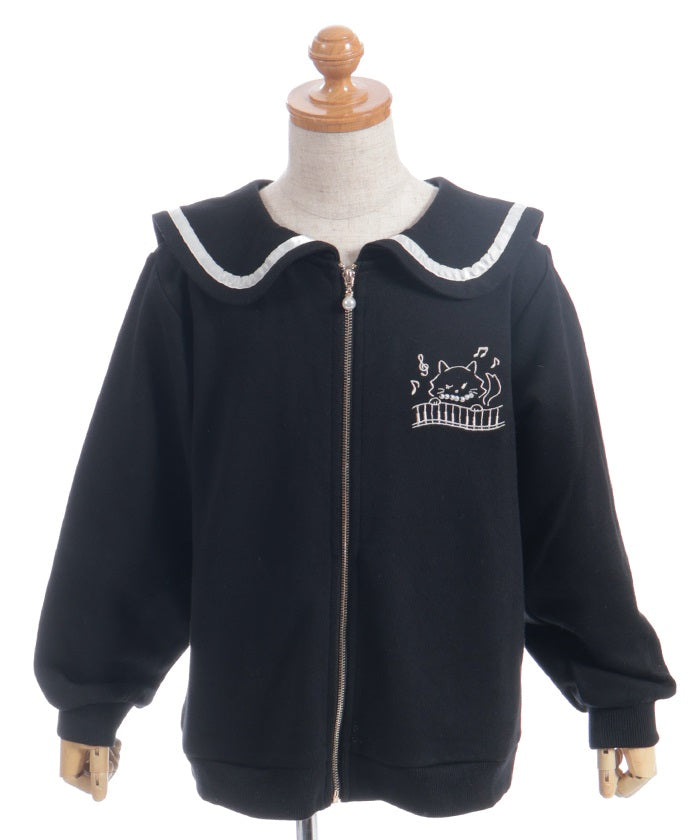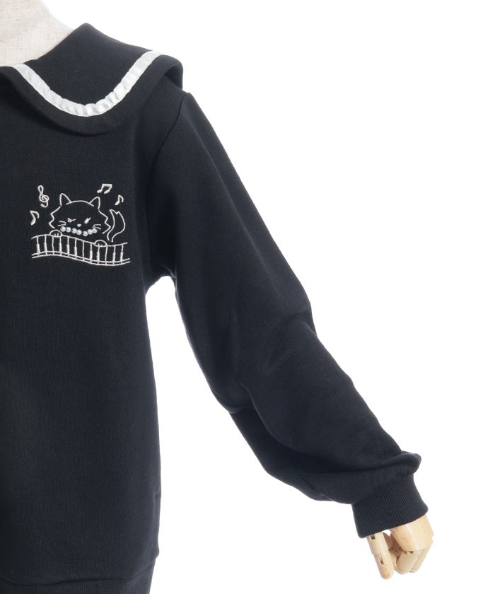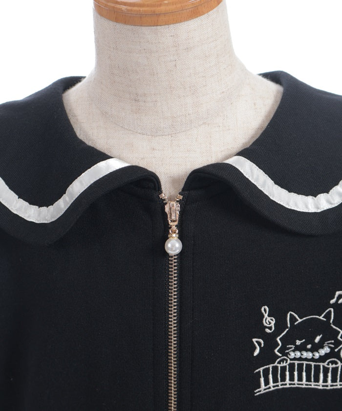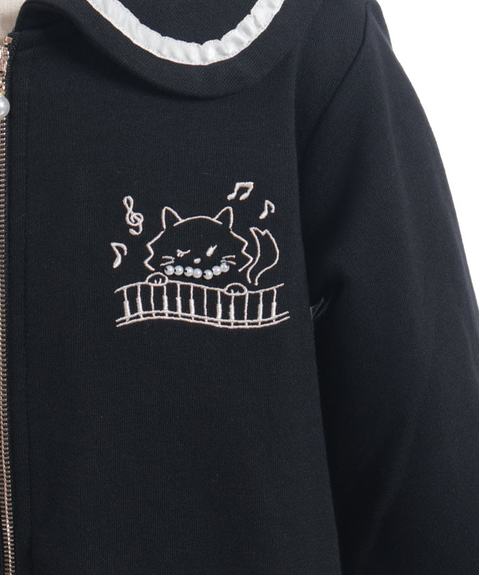 The oversized sailor collar with black lines creates a slightly classic look. The embroidery on the chest reveals a story of a cat playing the piano. It's packed with features that will make you want to wear it every day.